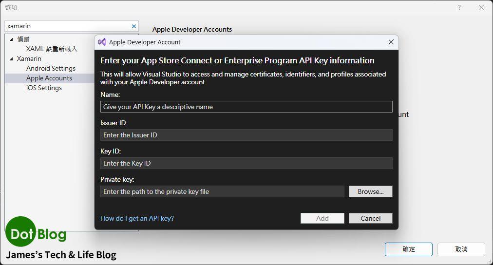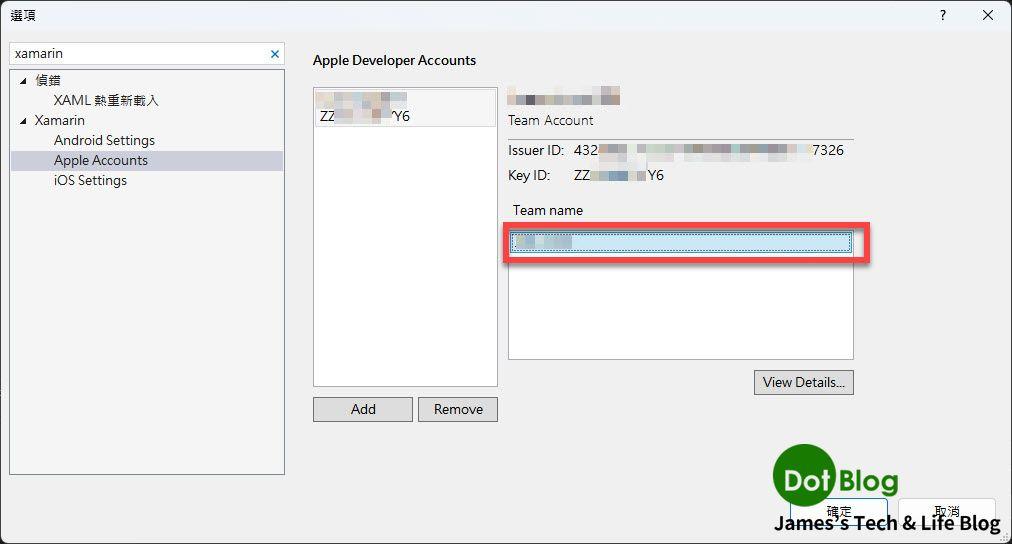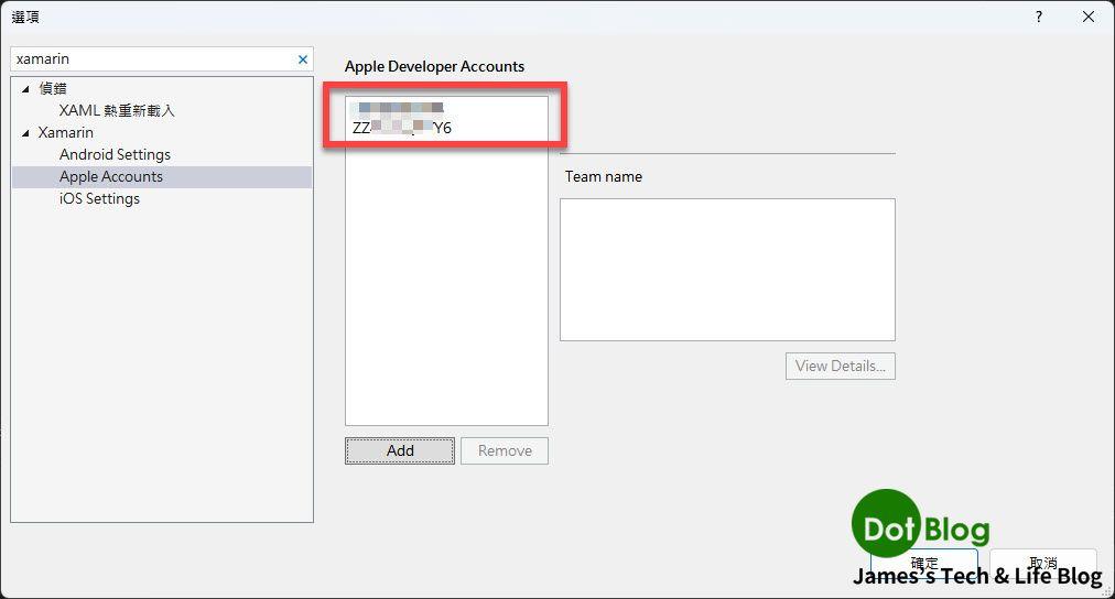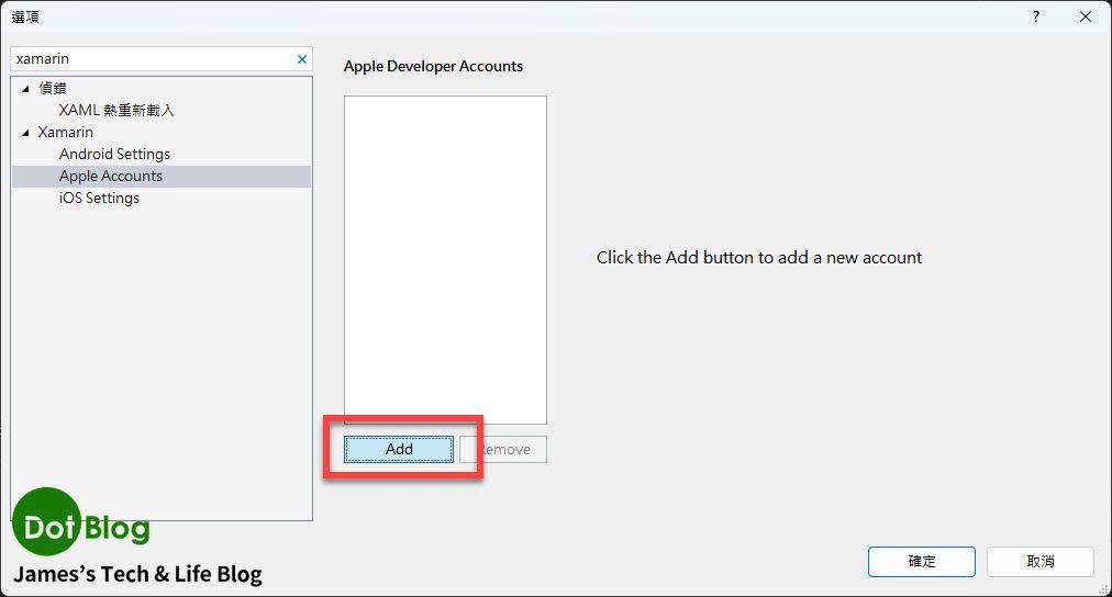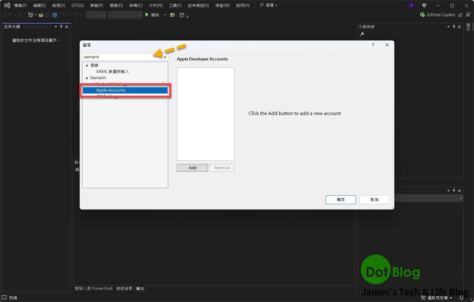 在出現的 "選項" 視窗中,透過搜尋 "Xamarin" 後在出現的選項中,找到 "Apple Accounts":