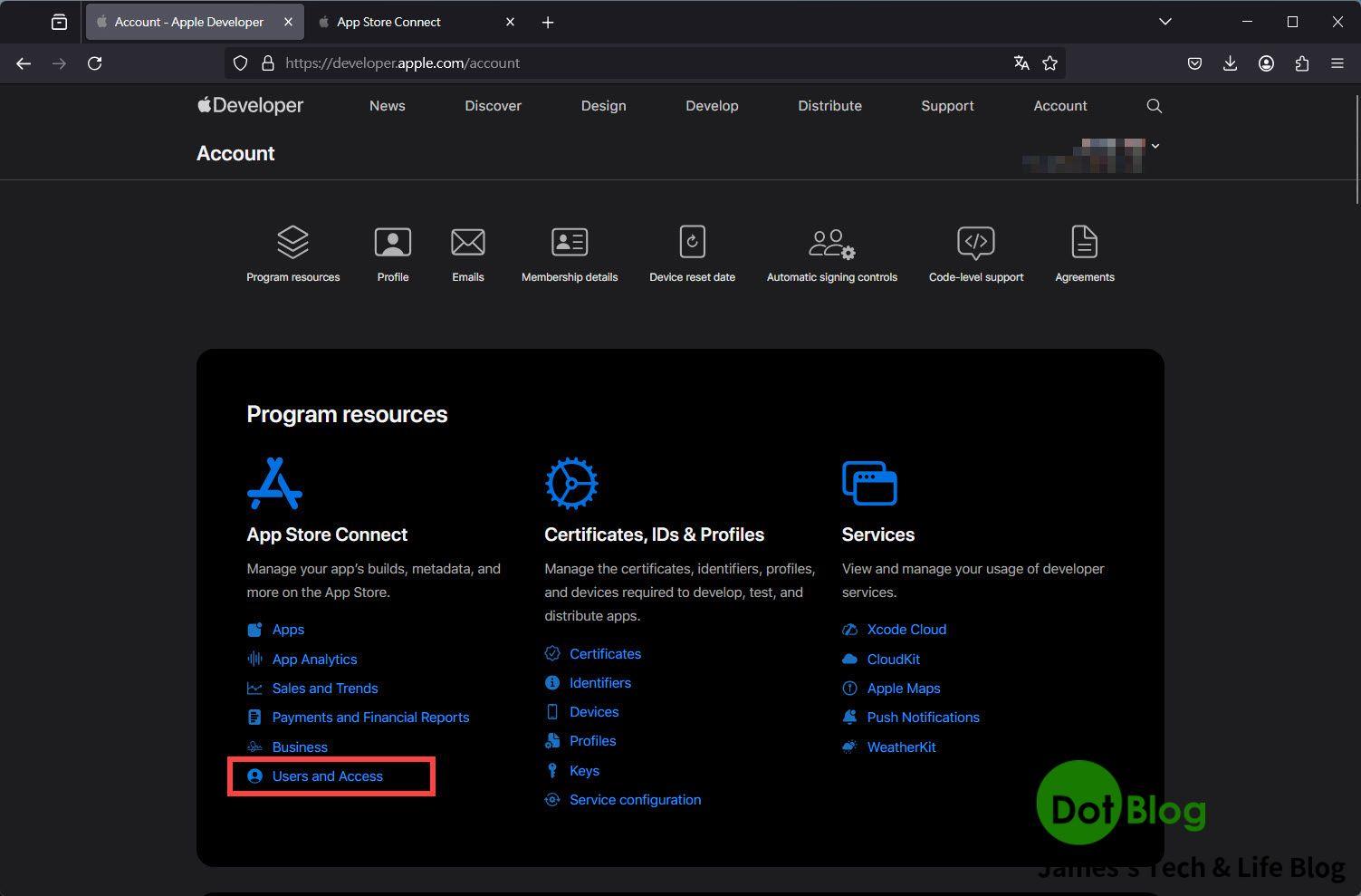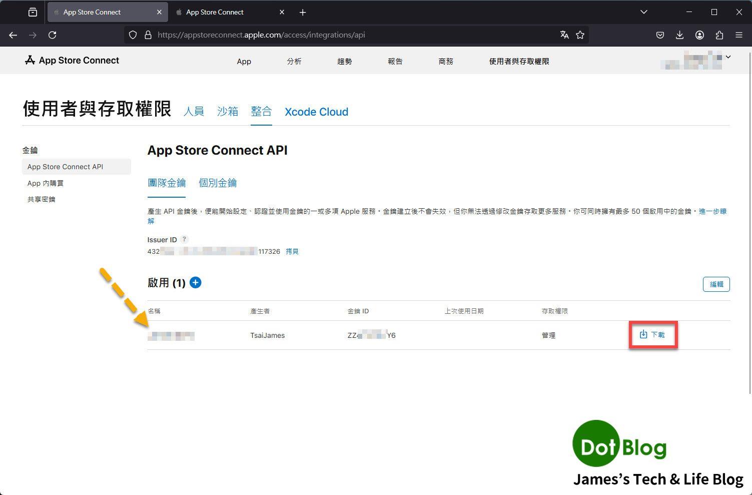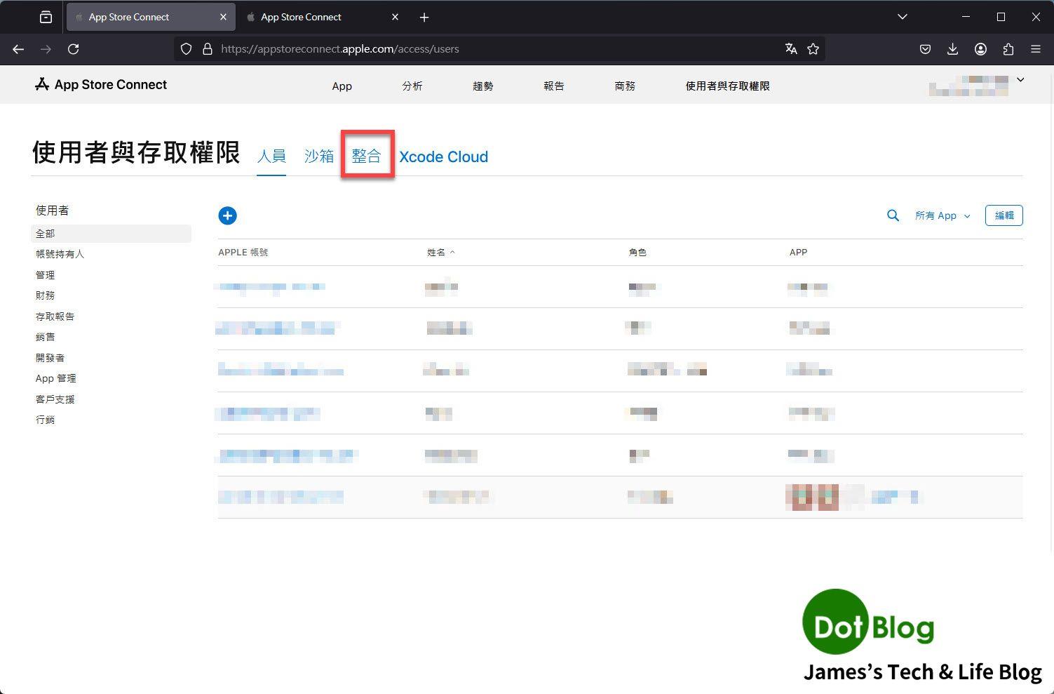 然後就會自動轉跳到 AppleStore Connect 的網站的 "使用者與存取權限"。