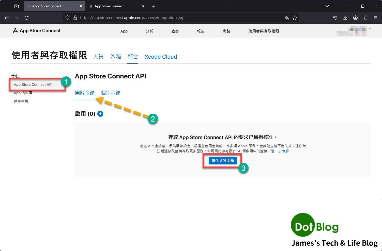 點選 App Store Connect API,並確認在 "團隊金鑰" 的部分(Visual Studio "目前" 僅支援使用團隊金鑰),再點選 "產生 API 金鑰" (如果曾經啟用過,要再產生新的請點選 "+"):