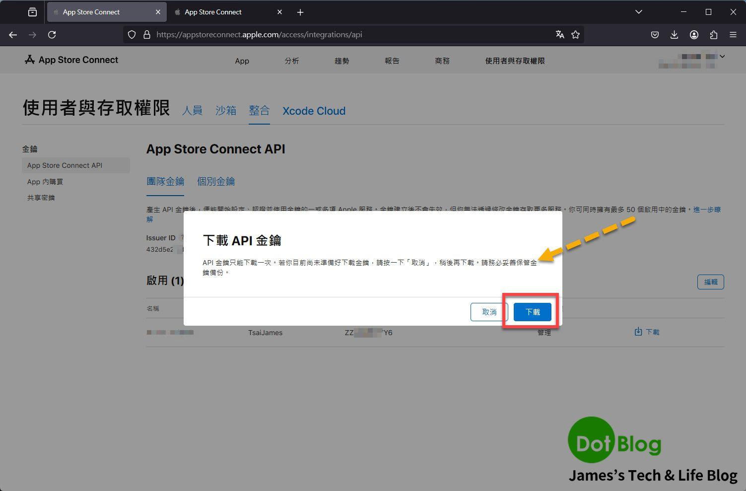 產生後,就可以看到多出了一個 API 金鑰,可點選 "下載":