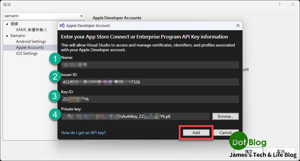 再次回到 Visual Studio 2022 的該畫面,依序填入相關資訊後,點選 "Add":