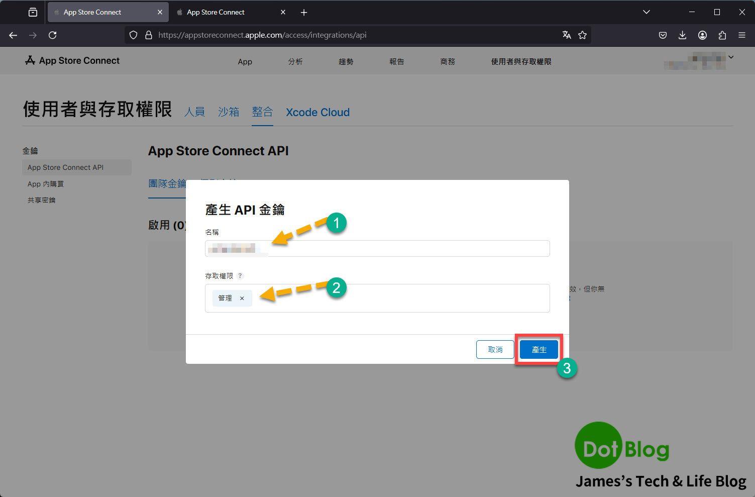 產生 API 金鑰的畫面中請輸入 "名稱"(任意取一個自己短期記憶內能識別的名稱即可) 與 "存取權限" (請詳細了解 Apple 的權限設計後再選擇)後,點選 "產生":