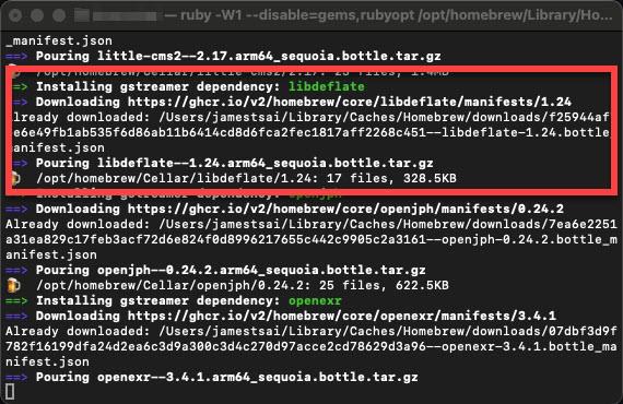 出現上述的字樣後,等待進度條跑到 100%;brew 就會再告知安裝 gstreamer 前需安裝的相依套件: