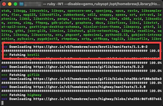 全部都下載完畢後, brew 會繼續自動安裝每個套件 (安裝該單一套件前會再驗證一次是否下載完成,安裝該套建完成後會把下載的壓縮檔刪除):