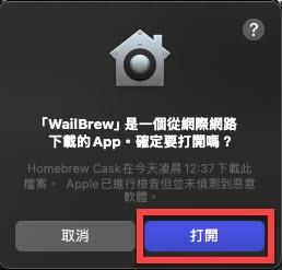 macOS 第一次啟動 Wailbrew 的時候會有這個警告,只能點選 "打開" 囉: