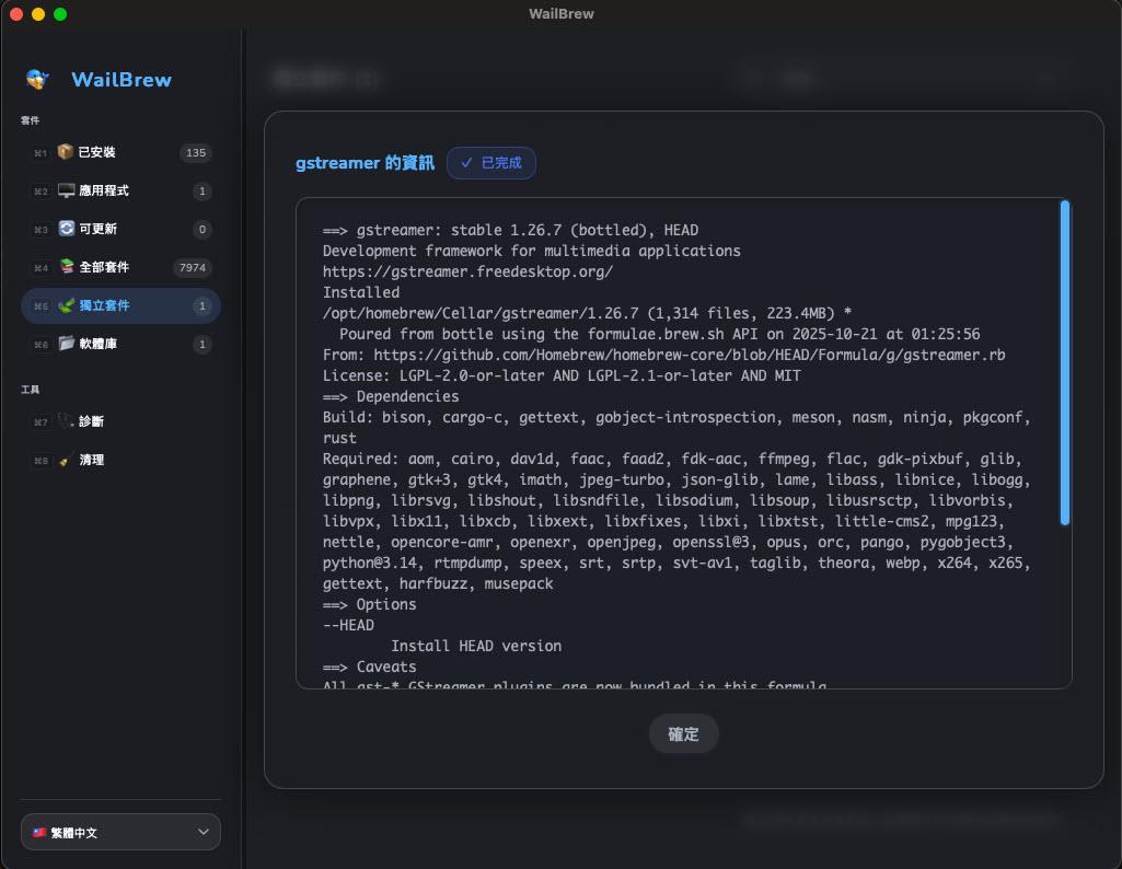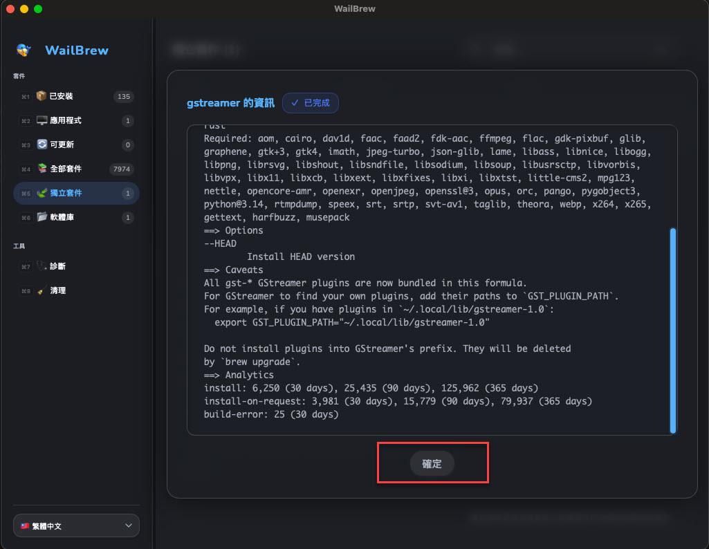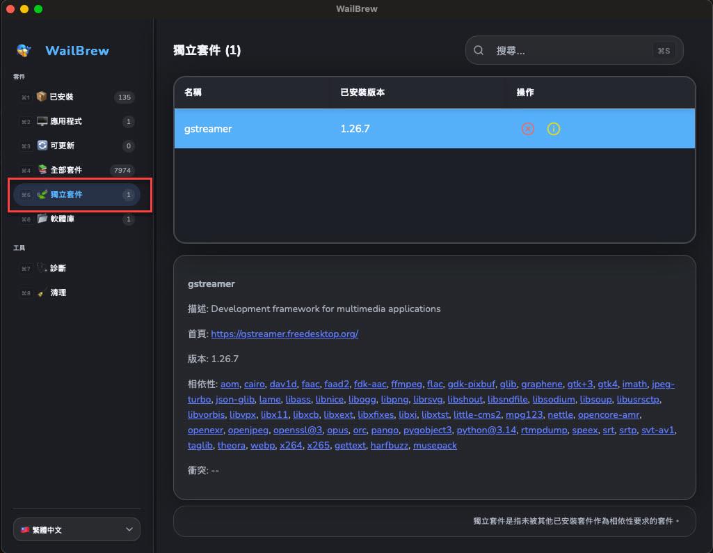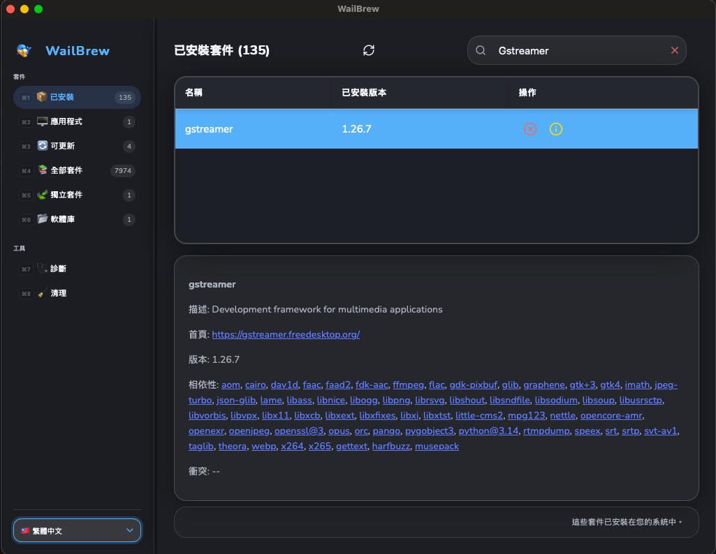 由於先前已經有先透過 brew 安裝過 GStreamer,所以第一次在 macOS 上打開 Wailbrew 後,第一個畫面會看到 "已安裝" 的 "Formulae (套件)" 有不少: