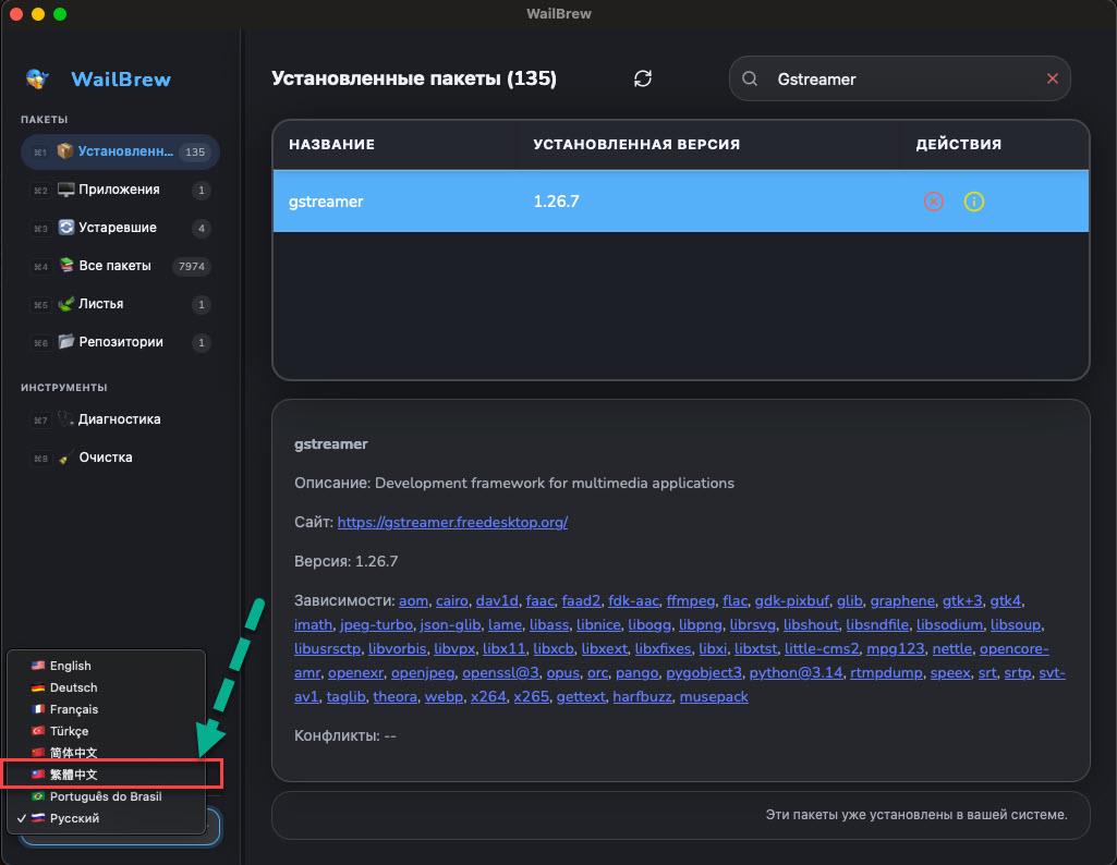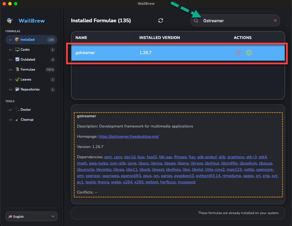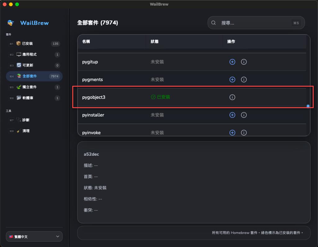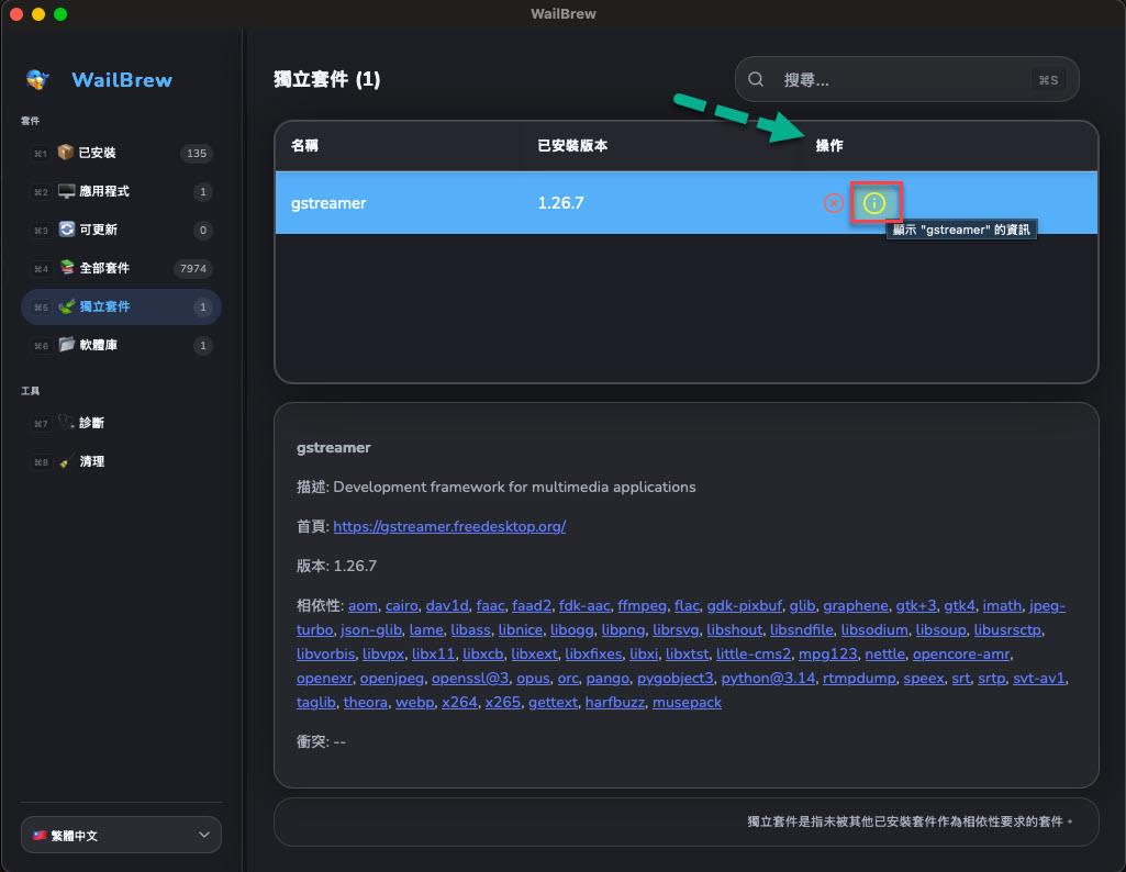 由於先前已經有先透過 brew 安裝過 GStreamer,所以第一次在 macOS 上打開 Wailbrew 後,第一個畫面會看到 "已安裝" 的 "Formulae (套件)" 有不少: