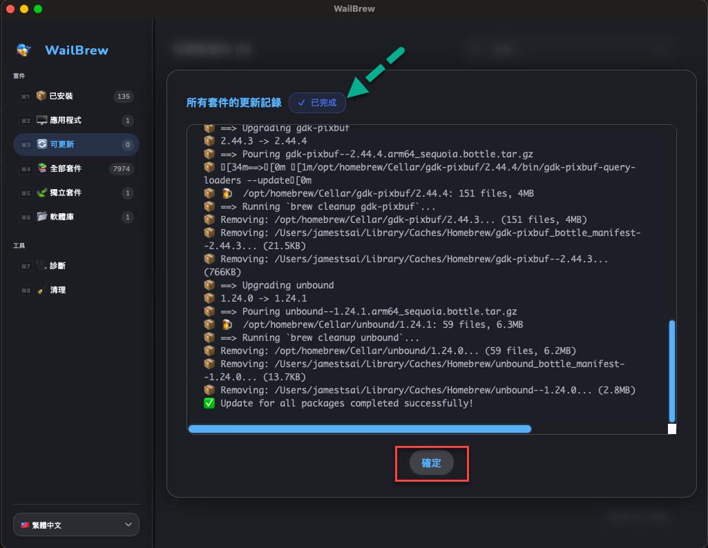 更新 "已完成",會顯示更新時的過程資訊,沒問題的話就點選 "確定":