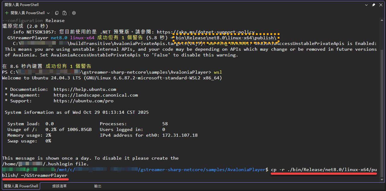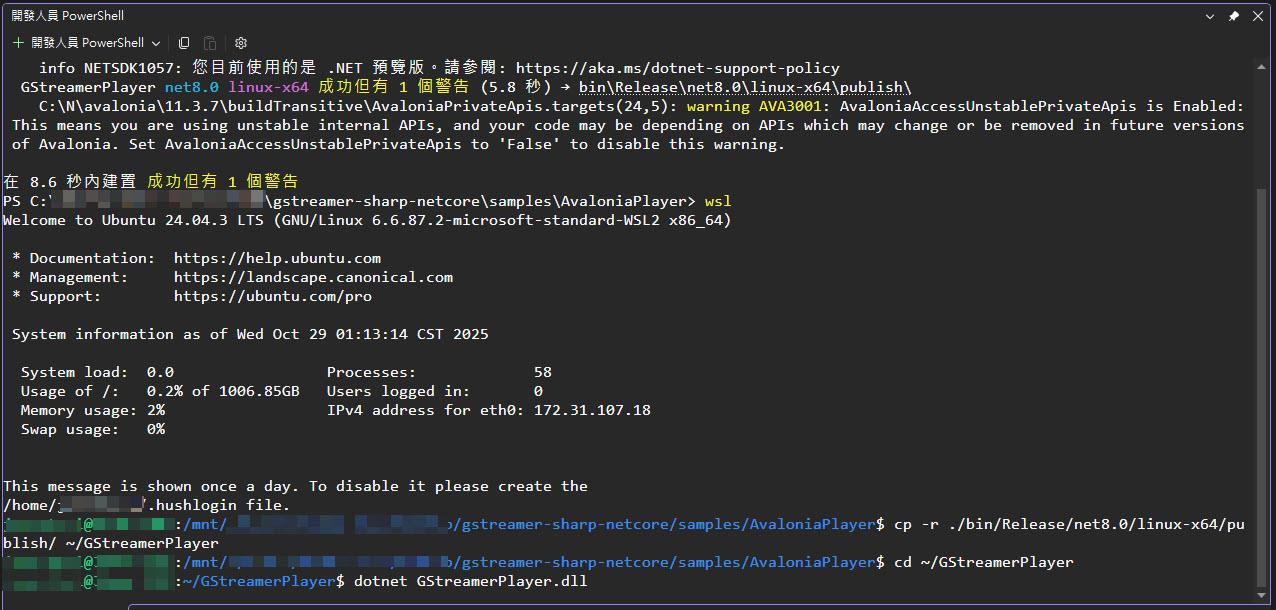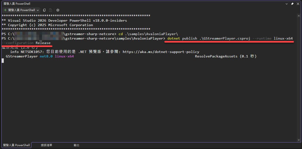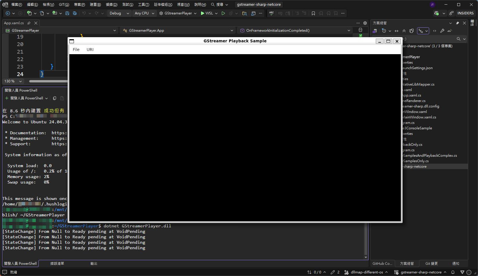 而在這邊是要在 Ubuntu 直接透過 dotnet GStreamerPlayer.dll 的方式來執行,不透過 Visual Studio 進行 WSL 的偵錯執行。