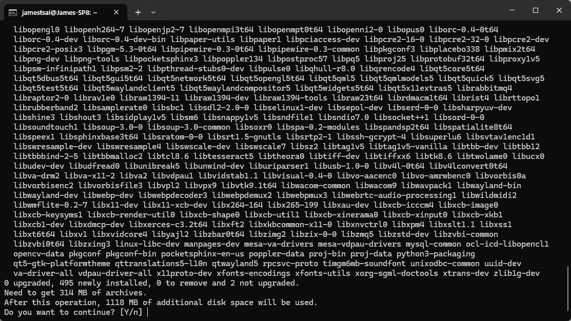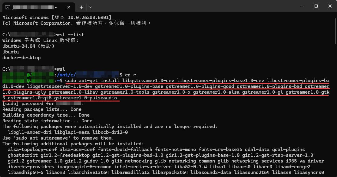 由於此 WSL 的 Ubuntu 環境 尚未安裝 GStreamer 及其所有的相依套件,所以透過下列 apt-get 安裝: