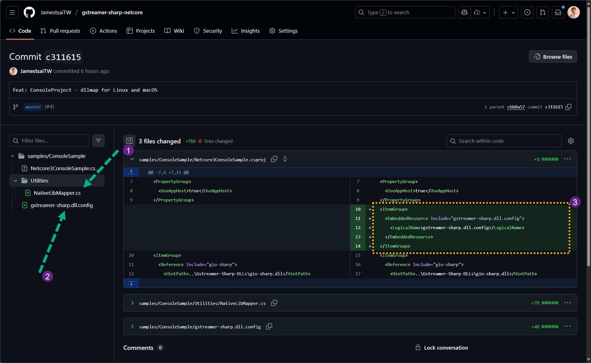 其中多了 NativeLibMapper.cs 跟 gstreamer-sharp.dll.config 這兩個檔案;而在 csproj 當中將 gstreamer-sharp.dll.config 設定為 EmbeddedResource。