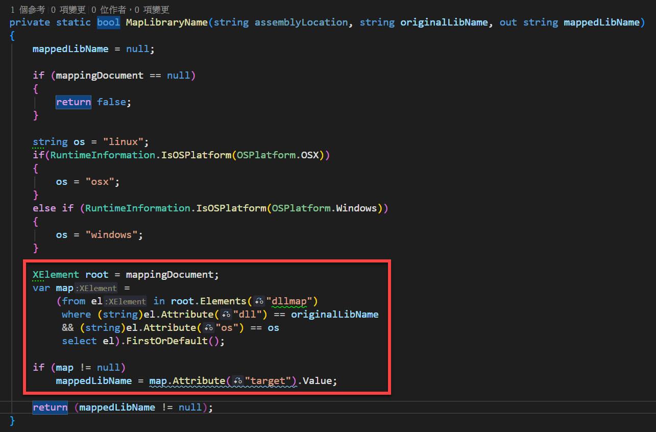 而 NativeLibMapper.cs 當中則是透過 NativeLibrary 處理讀取 "gstreamer-sharp.dll.config" 所設定的內容,並透過其值呼叫該平台的 Native Library 名稱: