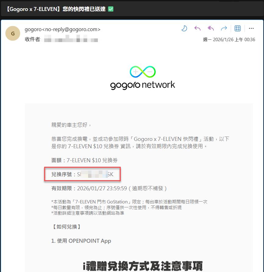 正常來說 Gogoro 的車主都會在 Gogoro 留下一組 Email 方便取得 Gogoro 寄送相關的帳單或聯絡資訊,而這張 7-ELEVEN 的 10 元兌換禮也就會寄送到這組 Email 中: