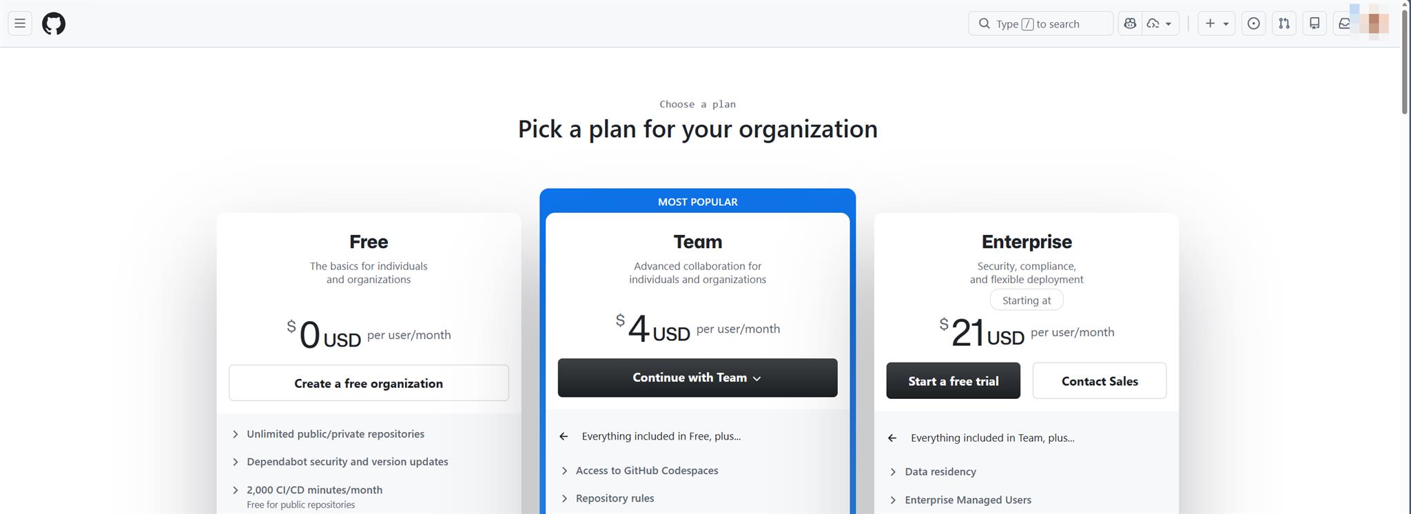 這邊選擇的是屬於要使用 GitHub 的 Plan;也就是說如果這邊選擇了 Team 這個 Plan 的話,要再疊加後面 GitHub Copilot 所選擇的 Plan 費用。