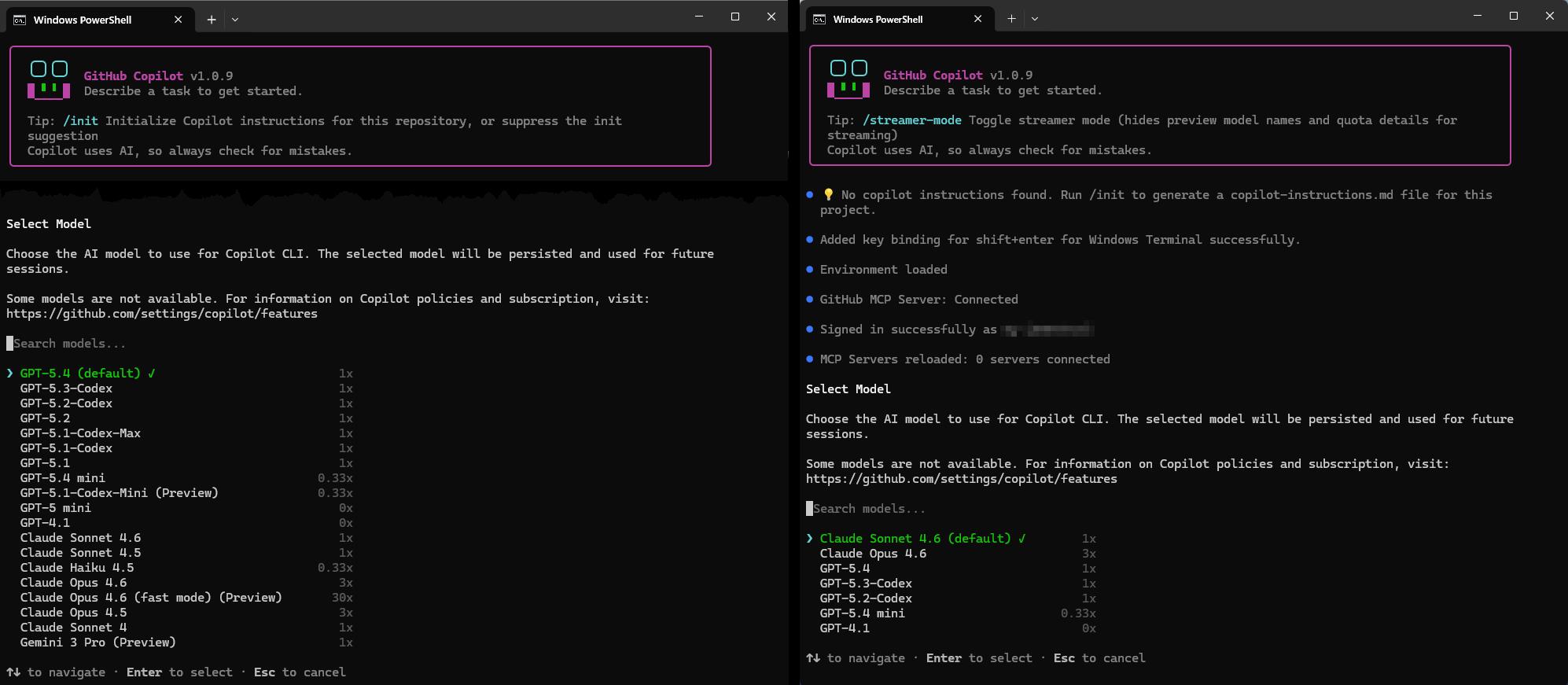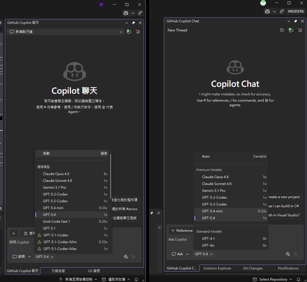 上述對照並不是要強調 Copilot Pro+ 可以選的 model 就比較多,就是比 GitHub Copilot Business 好。而是因為所選擇 GitHub Copilot 的 Plan 不同,會看到終端 (GitHub Copilot Chat / CLI) 可選的 model 就會有所不同。
