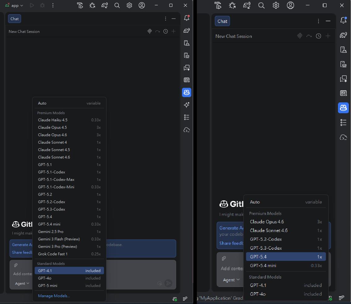 4. 在 Android Studio 使用 GitHub Copilot Chat 的 AI model 選項。