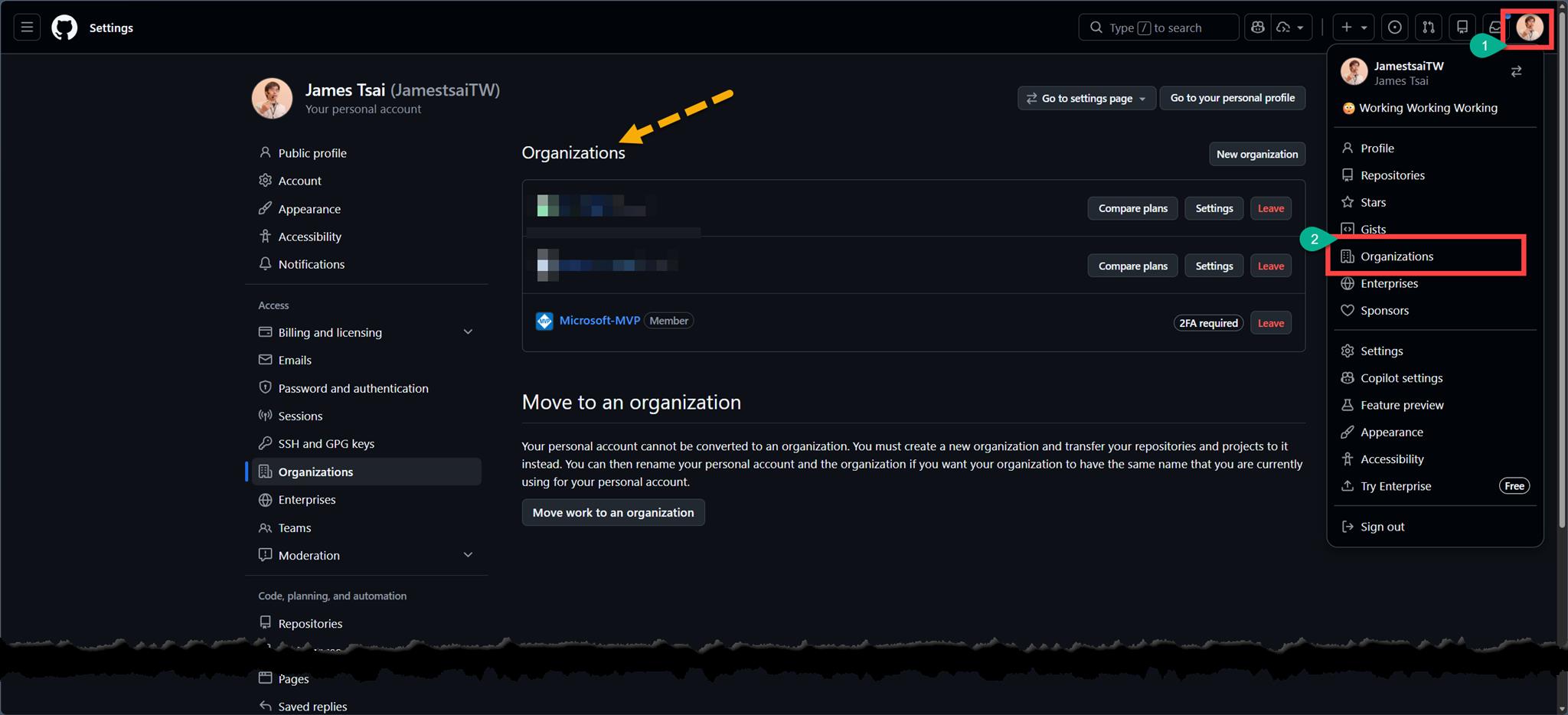 在 GitHub 底下在頭像點選的選單出來後,可以看到 "Organizations" 的選項,點選後的畫面大概如下: