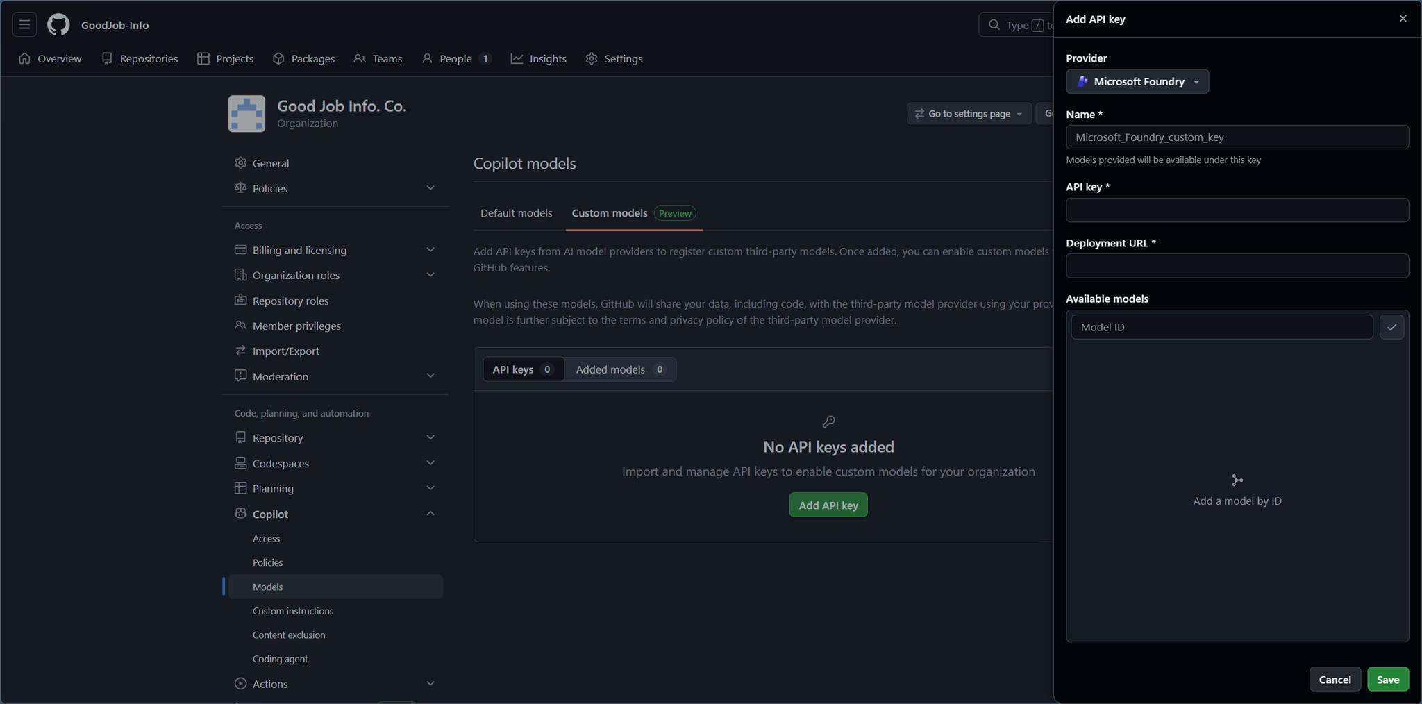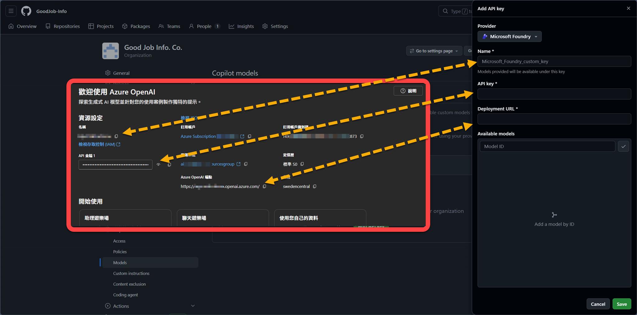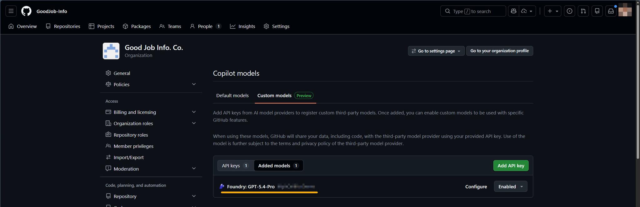 不過,既然 Microsoft Foundry 已經有提供 GPT-5.4-Pro 的 model 了,而且 GitHub Copilot 在 Organtization 的設定當中也提供 Custom models 的設定,那就把它們串起來吧!