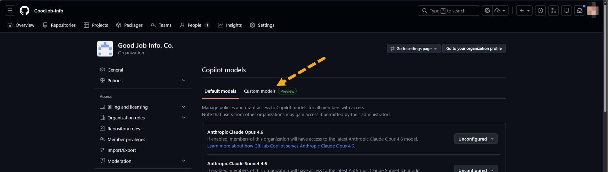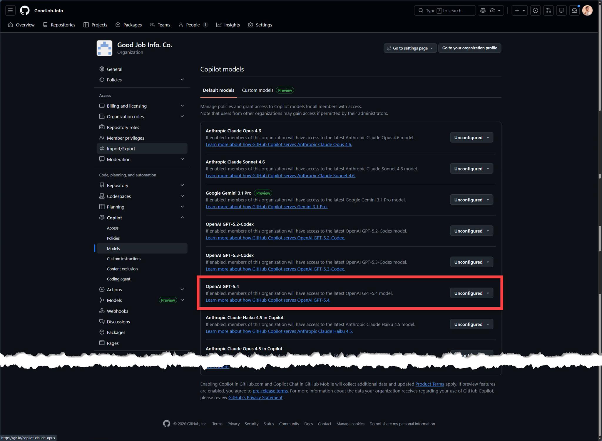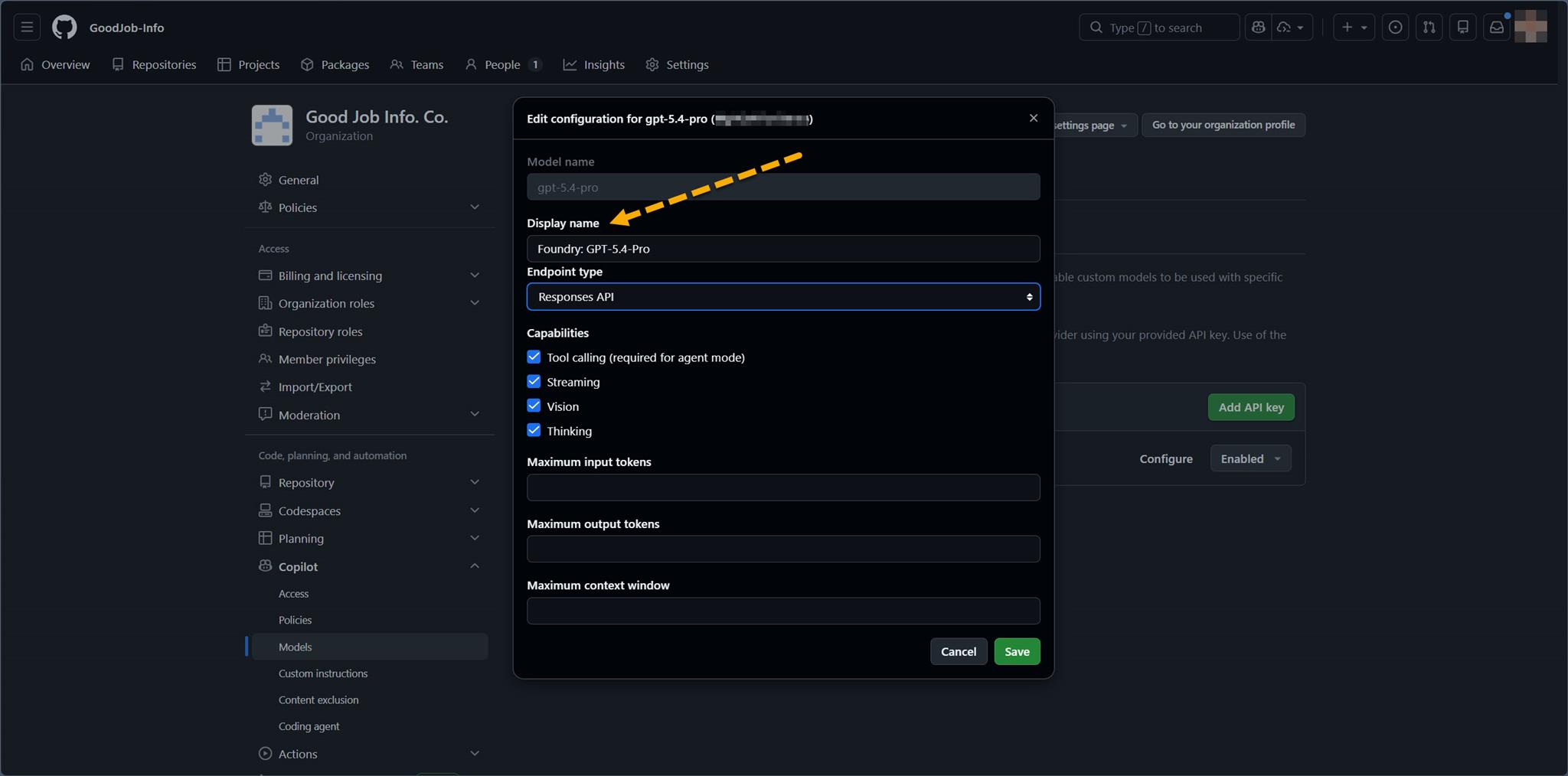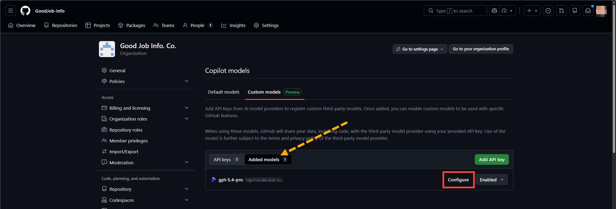 不過,既然 Microsoft Foundry 已經有提供 GPT-5.4-Pro 的 model 了,而且 GitHub Copilot 在 Organtization 的設定當中也提供 Custom models 的設定,那就把它們串起來吧!