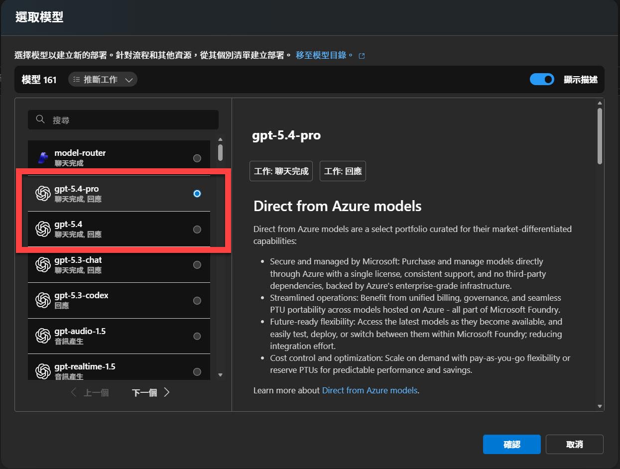 在同一天的 Microsoft Foundry 也宣布提供 OpenAI 的 GPT-5.4 / GPT-5.4-Pro,過沒多久就可以在 Azure 提供的 models 當中可以選擇 GPT-5.4 / GPT-5.4-Pro: