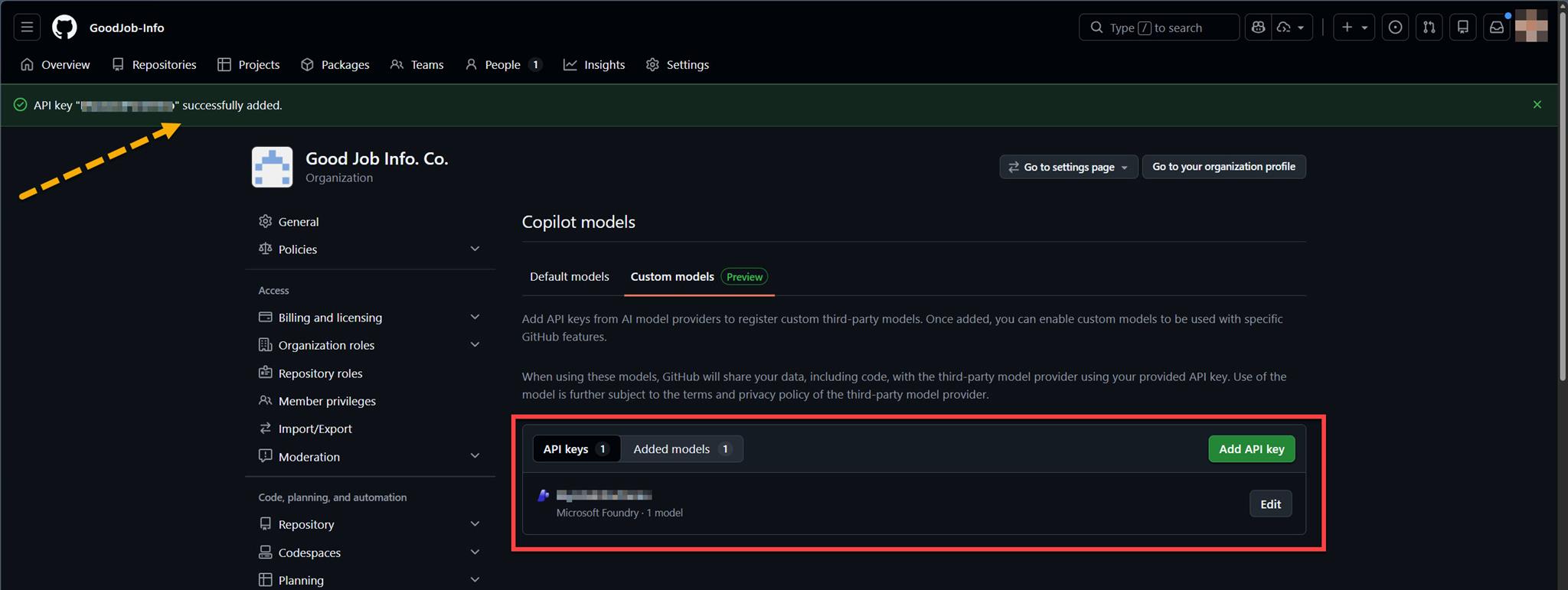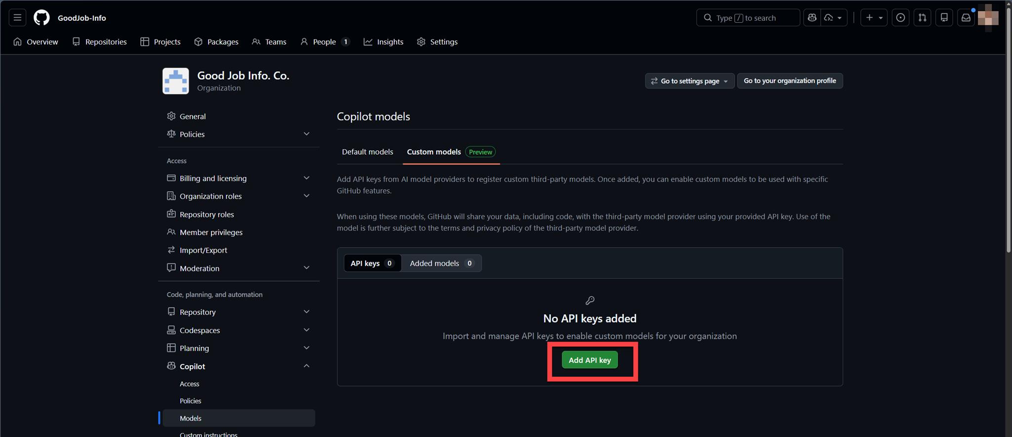 所以切到 Custom models (Preview) 後,點選 "Add API key":