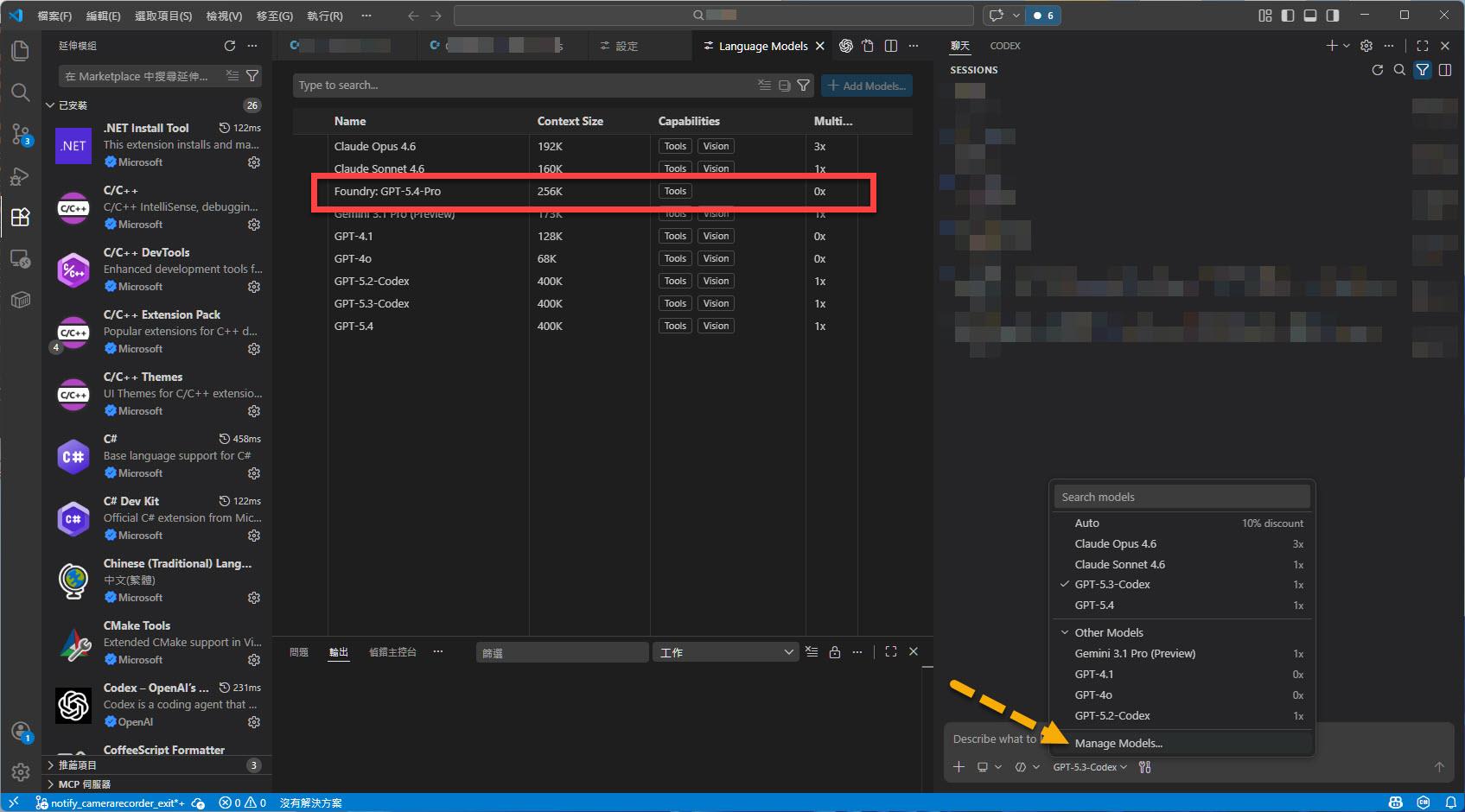 點選 "Manage Models…" 在 "Language Models" 的設定中會看到前面所設定的 "Foundry: GPT-5.4-Pro":