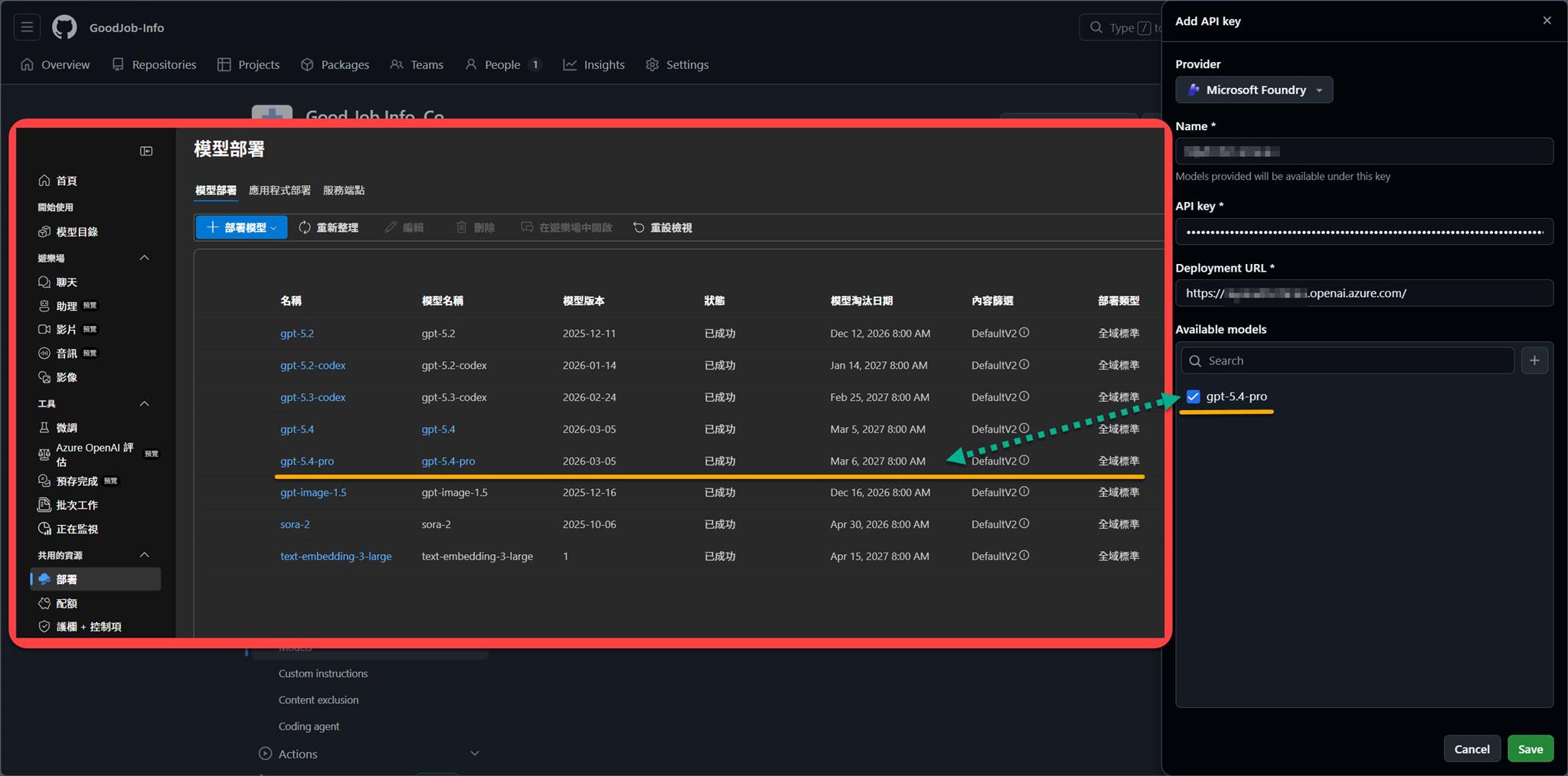 Available models 則自行填寫該 Microsoft Foundry 的 OpenAI 資源當中已經部署的 models,本篇的目標是 gpt-5.4-pro 的 model 串接,所以填寫後點選 "+",結果就會如下圖: