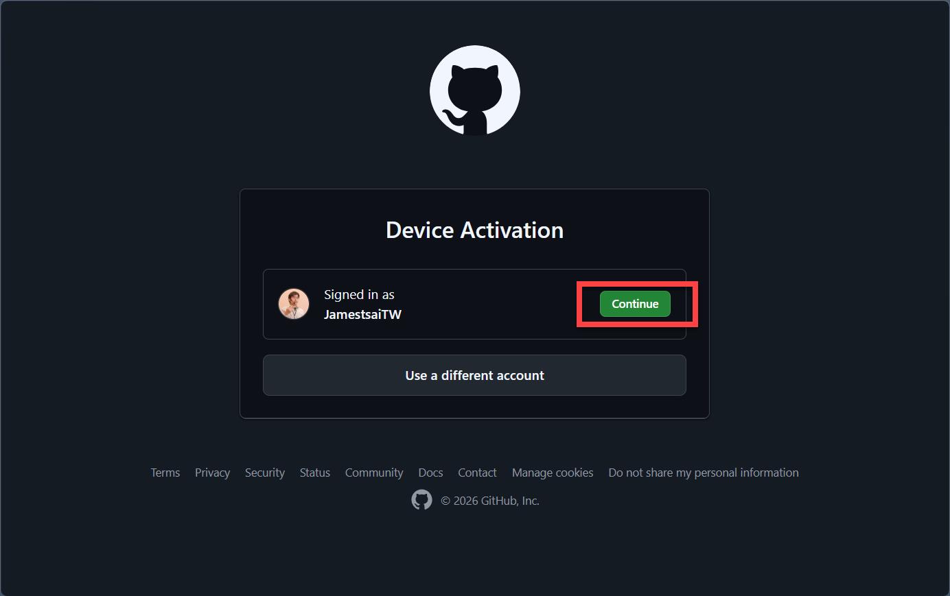 確認是你要使用的 GitHub 帳號後,就點選 "Continue"。