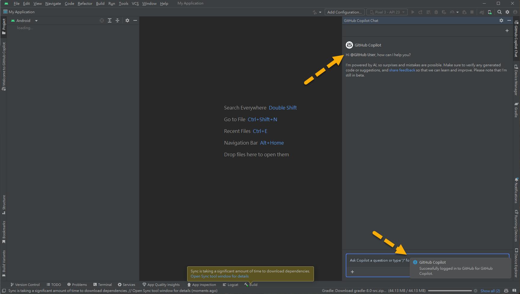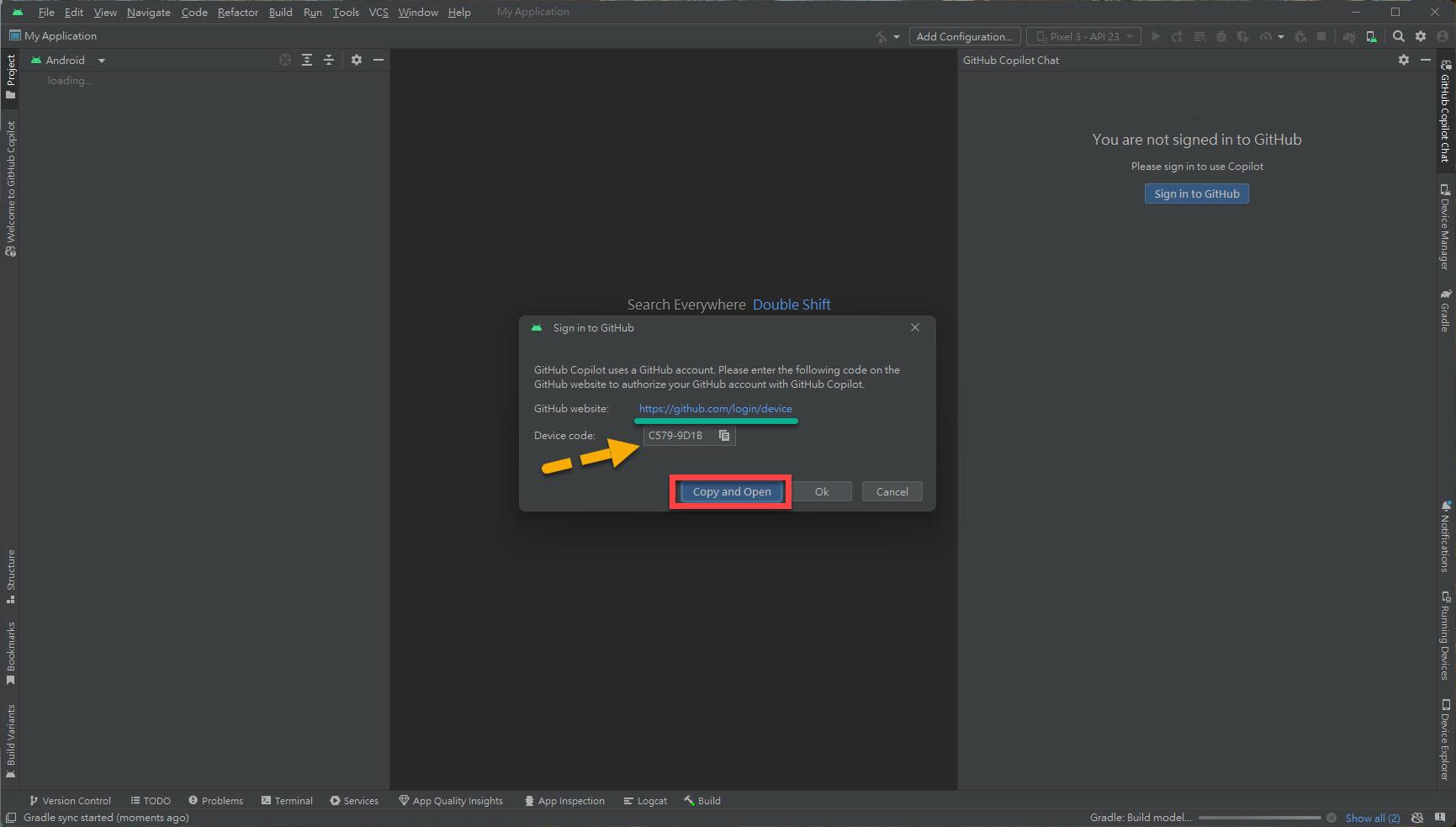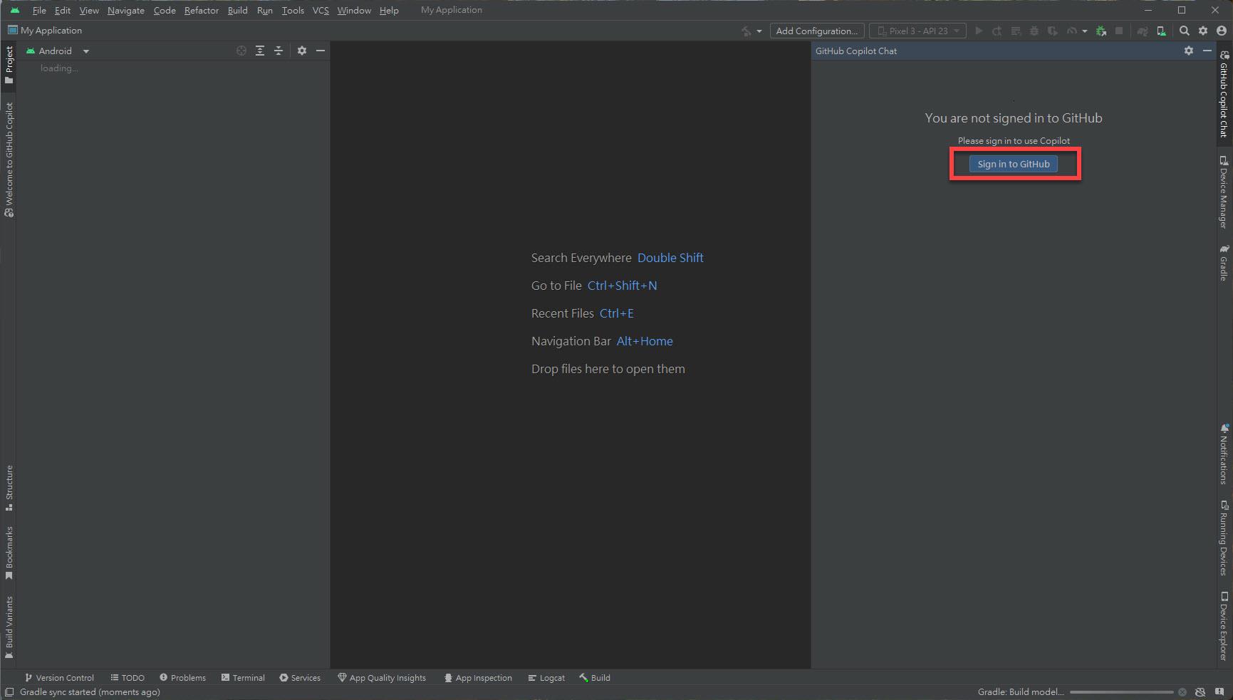 在 Android Studio 的專案主畫面中,開啟 "GitHub Copilot Chat" 登入 GitHub 帳號: