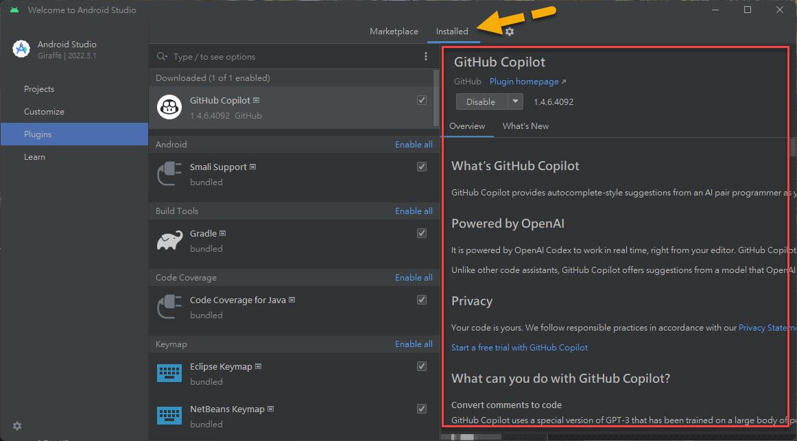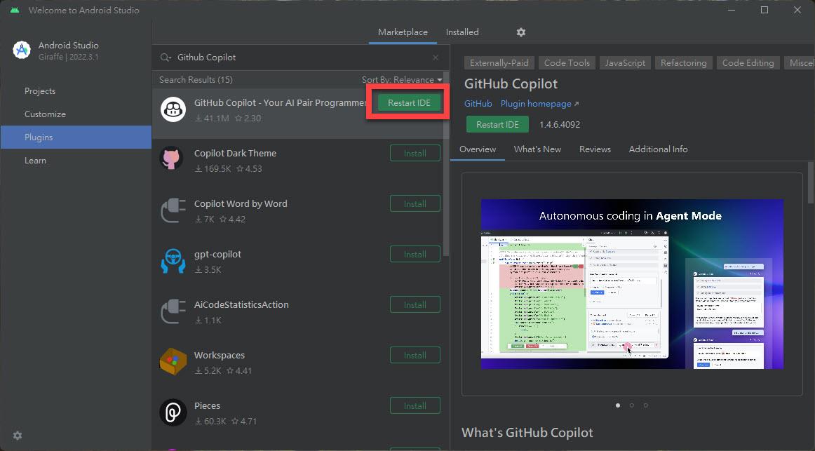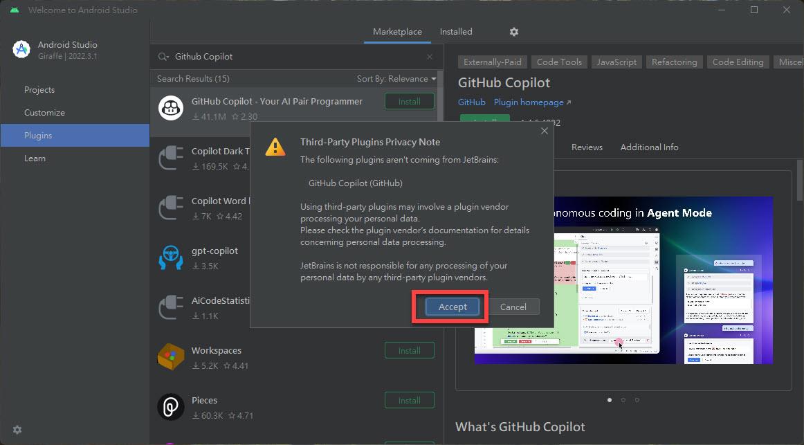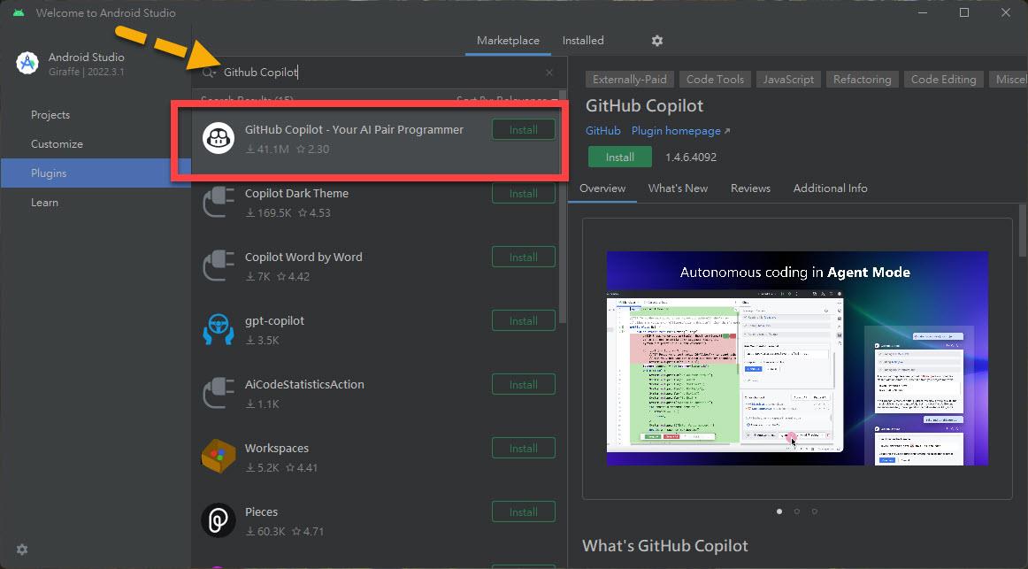 搜尋一下 Github Copilot 關鍵字,確實有 GitHub Copilot 的 Plugin 可安裝: