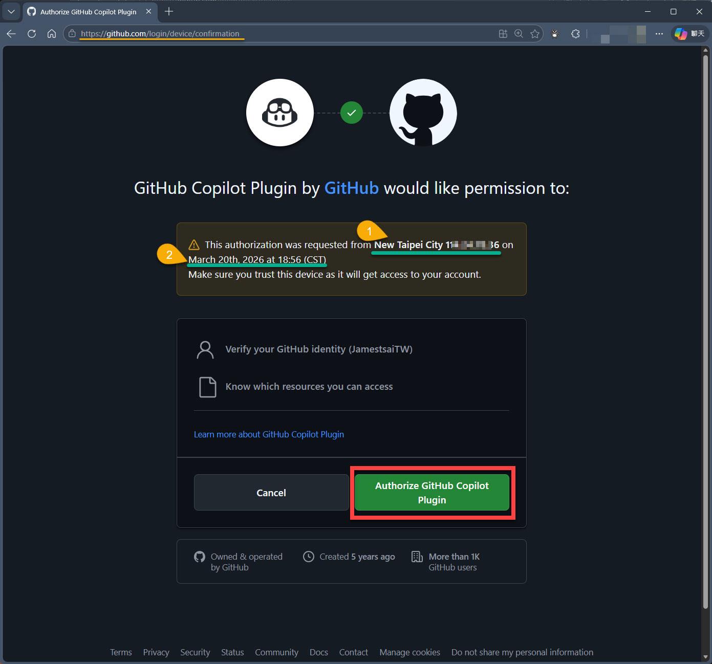 真的沒問題才按下 "Authorize GitHub Copilot Plugin"。