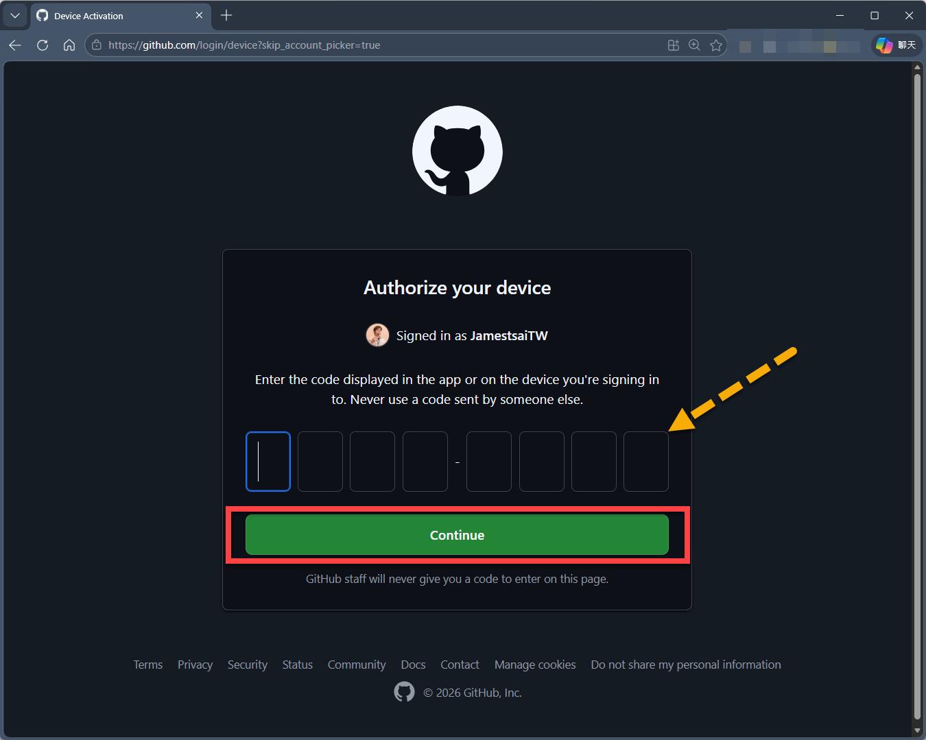 無論是透過瀏覽器自己到該 GitHub website 的網址瀏覽網頁 或是 透過點選 "Copy and Open",直接透由預設網頁瀏覽器開啟 GitHub website 的 "https://github.com/login/device" 這個網址進行互動,接下來的驗證流程體驗性都是一致的。