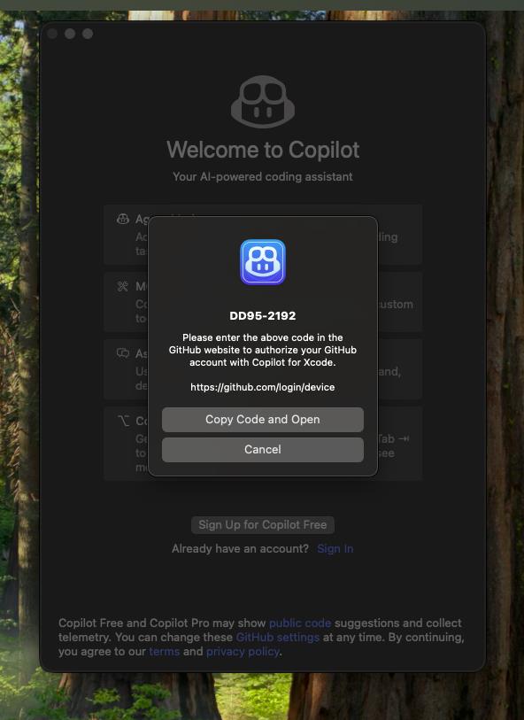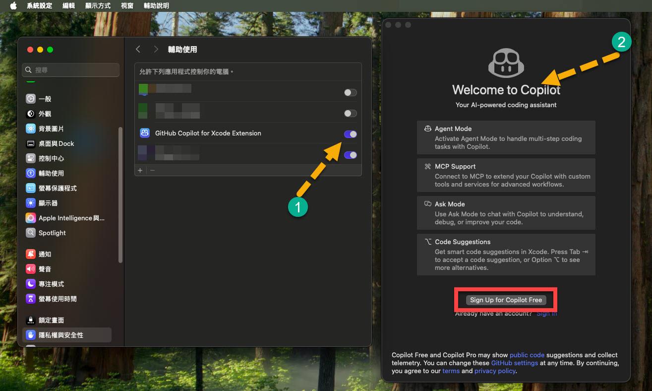 點選 "Sign Up for Copilot Free" 準備到 GitHub 上授權 GitHub Account 能在 Copilot for Xcode 中使用。