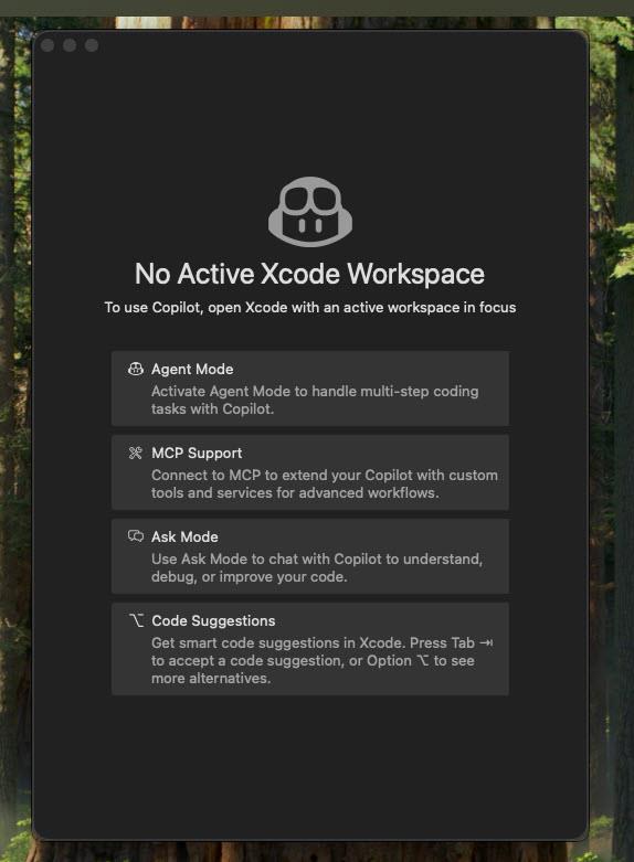 此時如果還沒有啟動 Xcode 的 Workspace (工作區),GitHub Copilot for Xcode 會呈現類似的畫面: