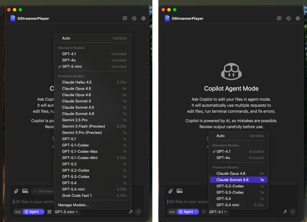 左為 GitHub Copilot Pro+ 的使用;右為 GitHub Copilot Business 的使用 (AI models 的選擇性是由 Organization 來授權管控):