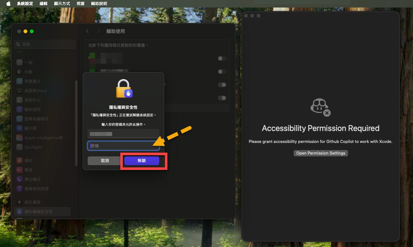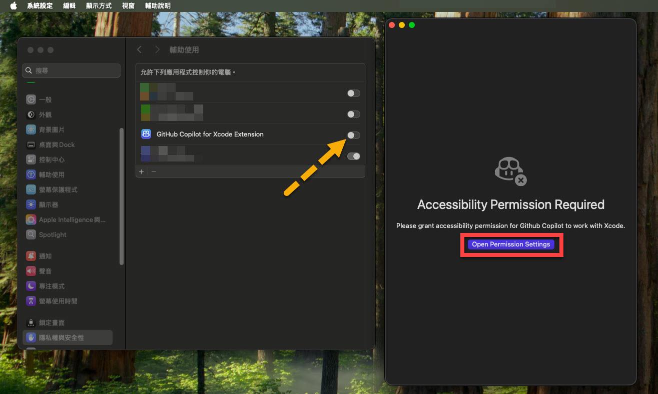 第一次啟動 "GitHub Copilot for Xcode" 會告知需要那些權限的調整並請求,點選 "Open Permission Settings":