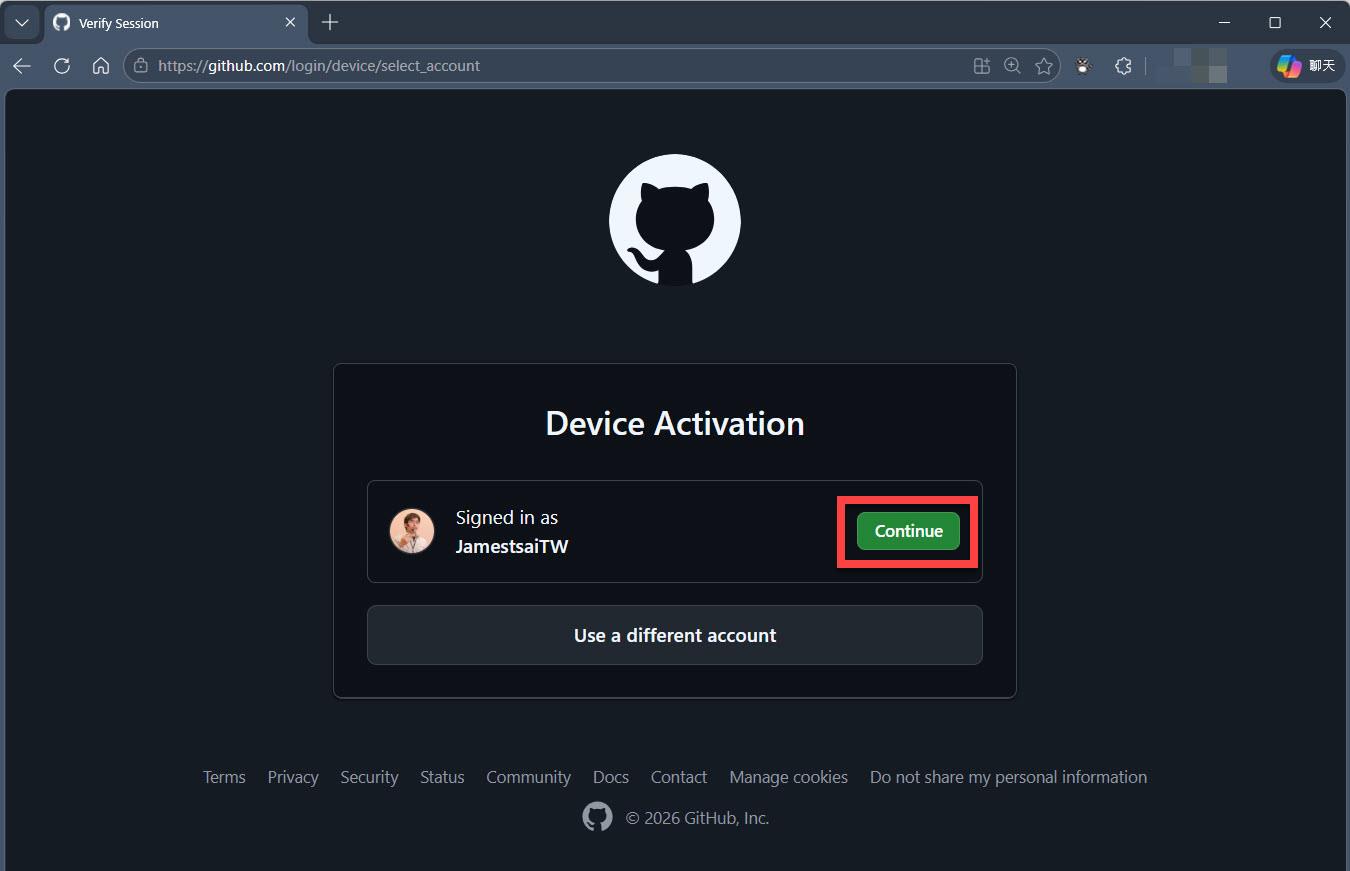 如果確認登入 GitHub 的該帳號是要使用 GitHub Copilot 的帳號沒錯,那就點選 "Continue"。
