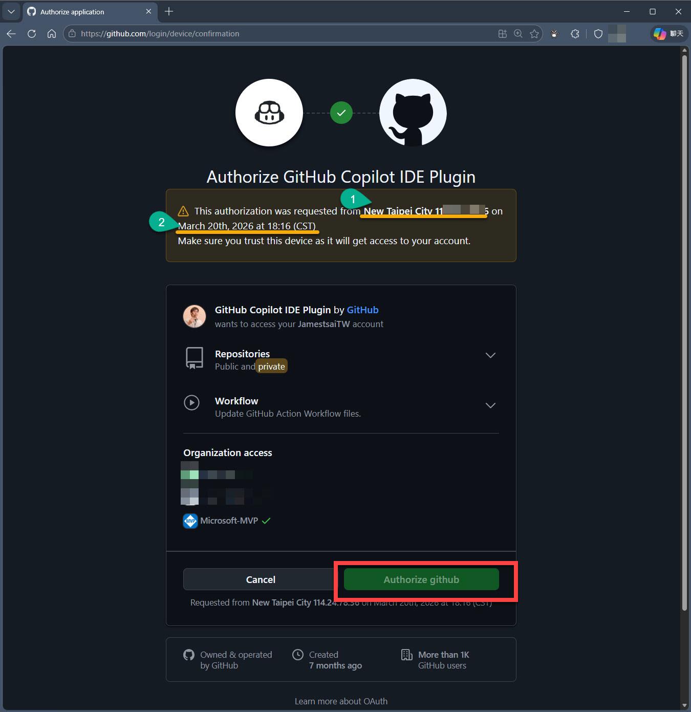 確認是否授權 "GitHub Copilot IDE Plugin" 使用: