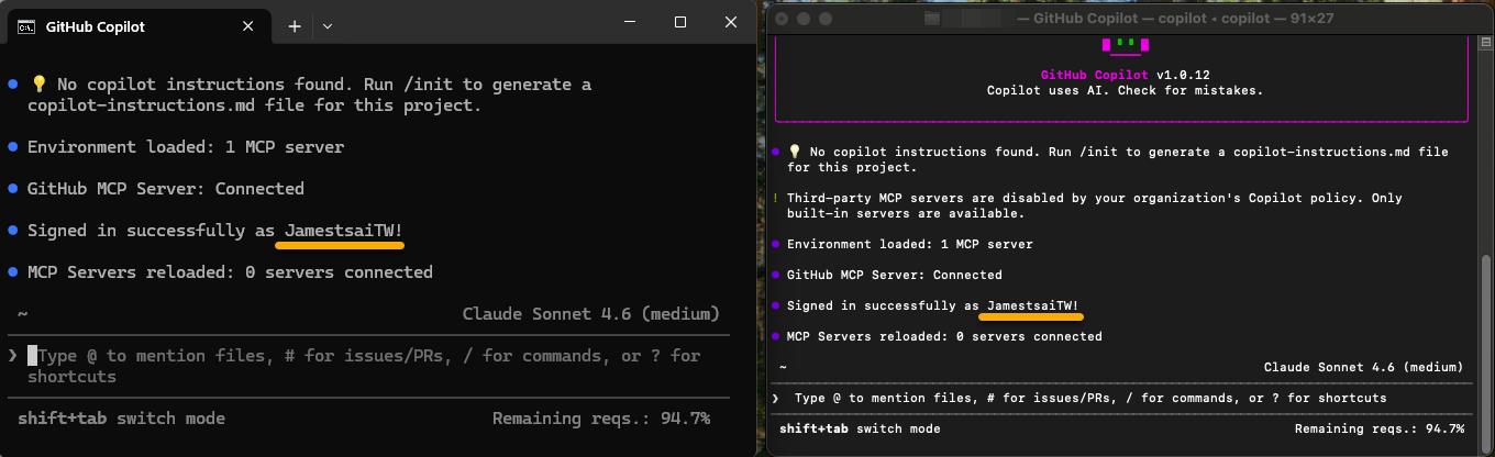 認證完成後,等待同步一下 GitHub Copilot CLI 會顯示登入成功: