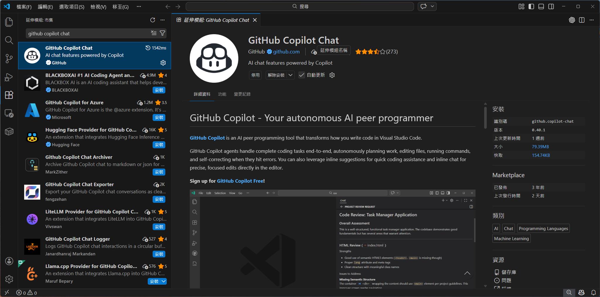 Visual Studio Code 也不用太多說什麼,在 Visual Studio Code 的延伸模組的市集當中搜尋一下 "GitHub Copilot Chat" 就可以安裝。