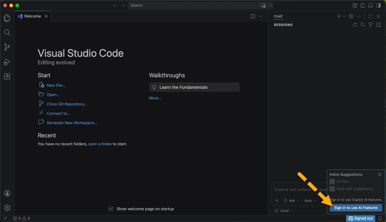 如果是在 Visual Studio Code 當中安裝好 GitHub Copilot Chat,要使用 GiHub Copilot,就點選 Visual Studio 右下角的 "Signed out":