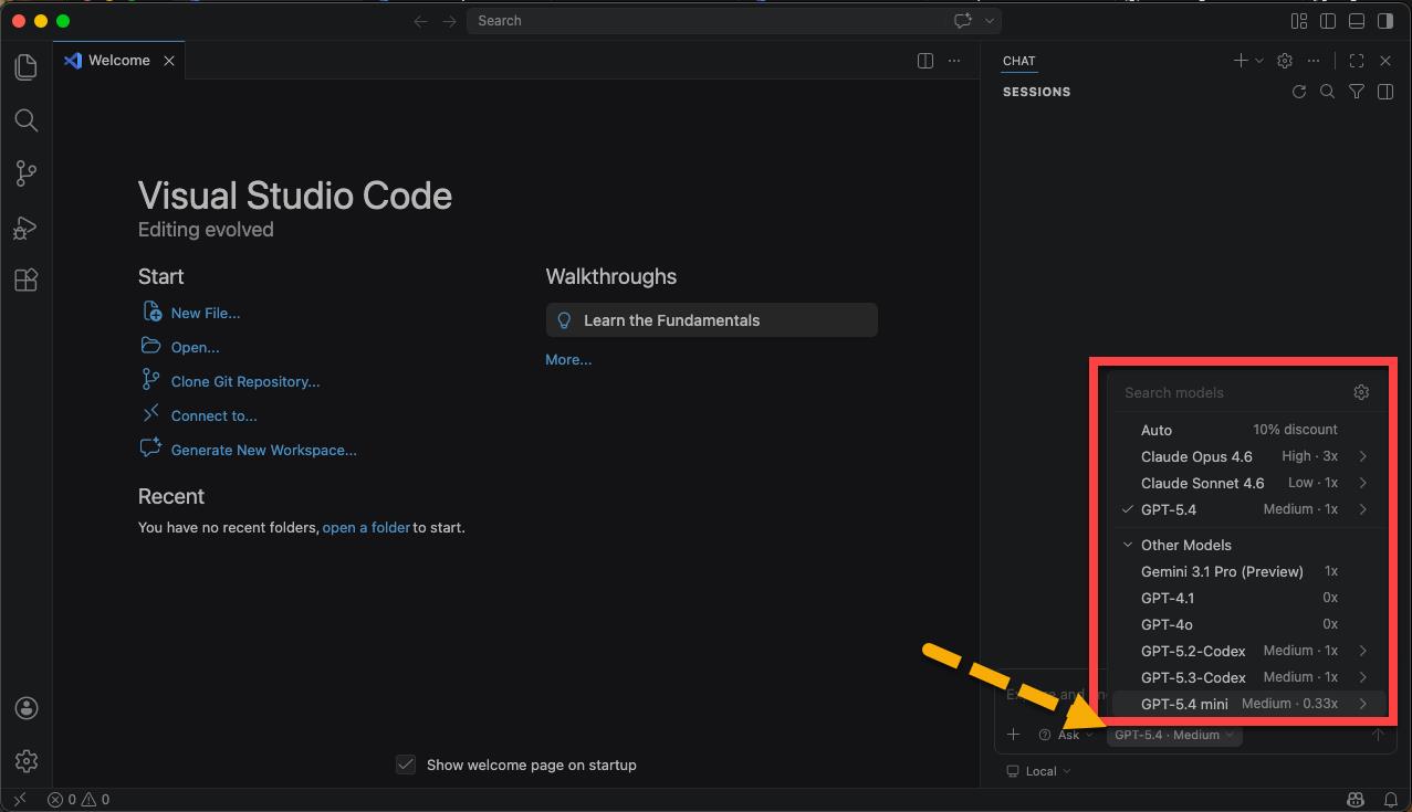 如果登入的 GitHub Account 有 GitHub Copilot 授權,就可以選擇所要使用的 AI model: