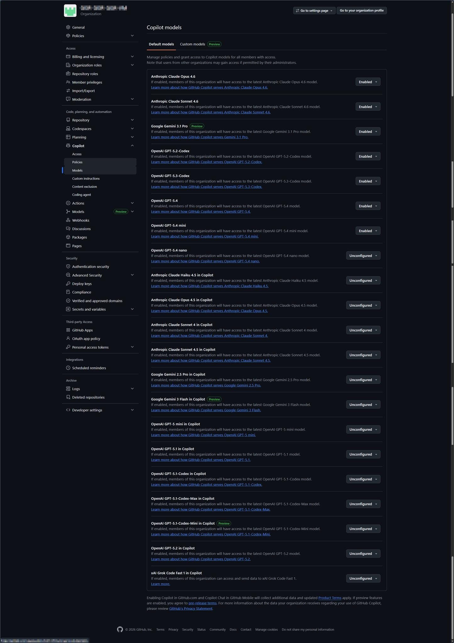 此登入的 GitHub Account 所使用的是 GitHub Copilot Business 的授權,若該 GitHub Account 所屬的 Organziation 有啟用該 AI model,就都可以立即使用。