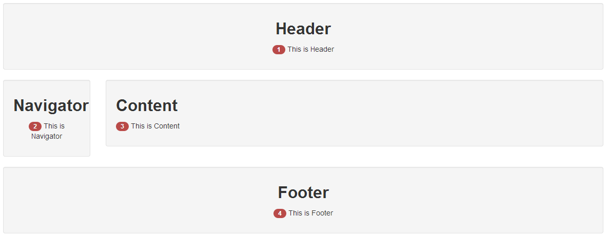 這麼一來, Header 就是一個橫跨十二欄寬的區塊, 然後左邊的 Navigation 佔兩個欄寬、Content 佔去右邊十個欄寬, 而最下方的 Footer 又是橫跨十二個欄寬。