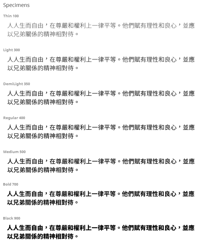 程式裡有個無法克服的問題, 那就是 CSS 的 font-weight 屬性雖然允許 100 ~ 900 這幾個數字, 但是對這些字體而言, 字體粗細只在 600 (IE) 或 700 (Chrome) 及以上才能看出變化。所以如果在網頁中使用這些字型 (包括微軟正黑體), 大家應該可以不必花心思去微調那些數字了; 使用 normal 和 bold 就足夠了。