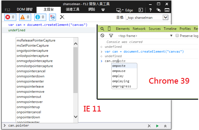 現在, 打 "can", 輸入一個句點, 再把你想查詢的功隨任意輸入, 你就會看到開發工具提供的 Intellisense 列表。例如在 IE 中打進 "pointer" 這個字, 你就能看到一串與這個字相關的許多方法, 但是在 Chrome 中怎麼打都看不到。這表示 IE11 支援包括 "pointerdown"、"pointermove" 等等方法, 也支援此類事件, 而 Chrome 則不支援。