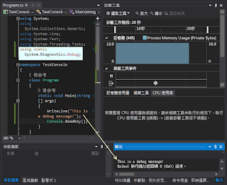 如下圖所示, 當你在 VS2015 進行偵錯時, 一個整合的診斷工具 (Diagnostic Tools) 畫面就會出現在工作區的右邊。在這個畫面中, 使用者可以選擇顯示監看記憶體和 CPU 的負載情況, 作為參考。