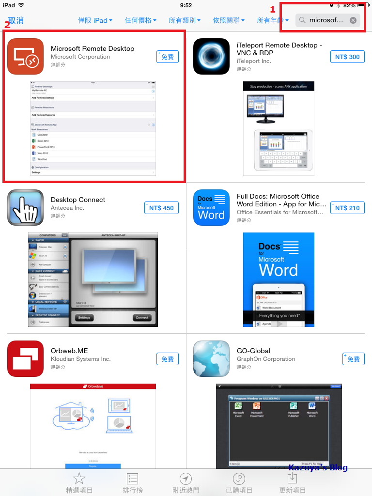 首先拿起看官手上的iPad/iPad mini開啟Apple Store然後收尋Microsoft Remote Desktop,然後點選Microsoft Remote Desktop APP 的免費按鈕下載,如下圖所示: