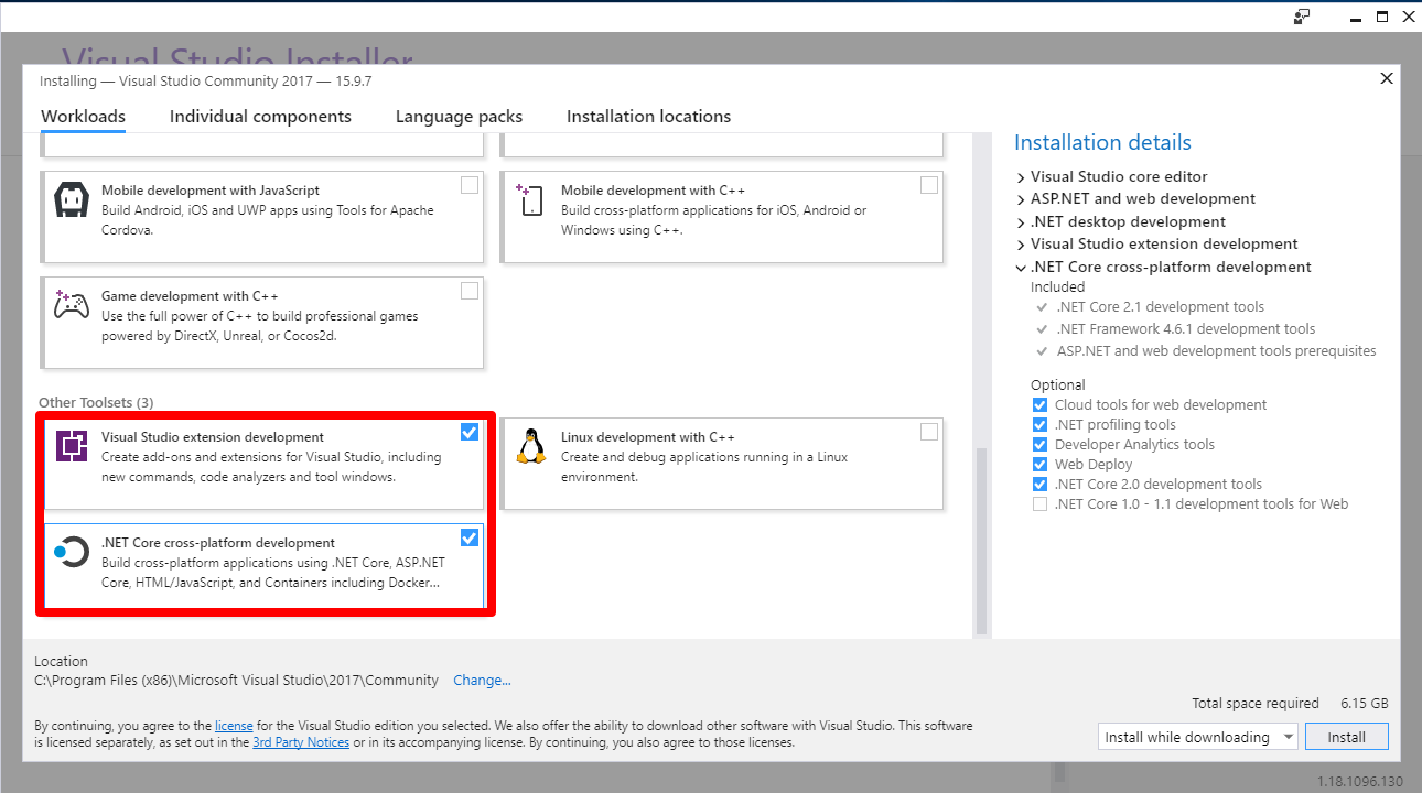 3.執行Visual Studio安裝器之後,請勾選一些會用到的功能(如下圖)