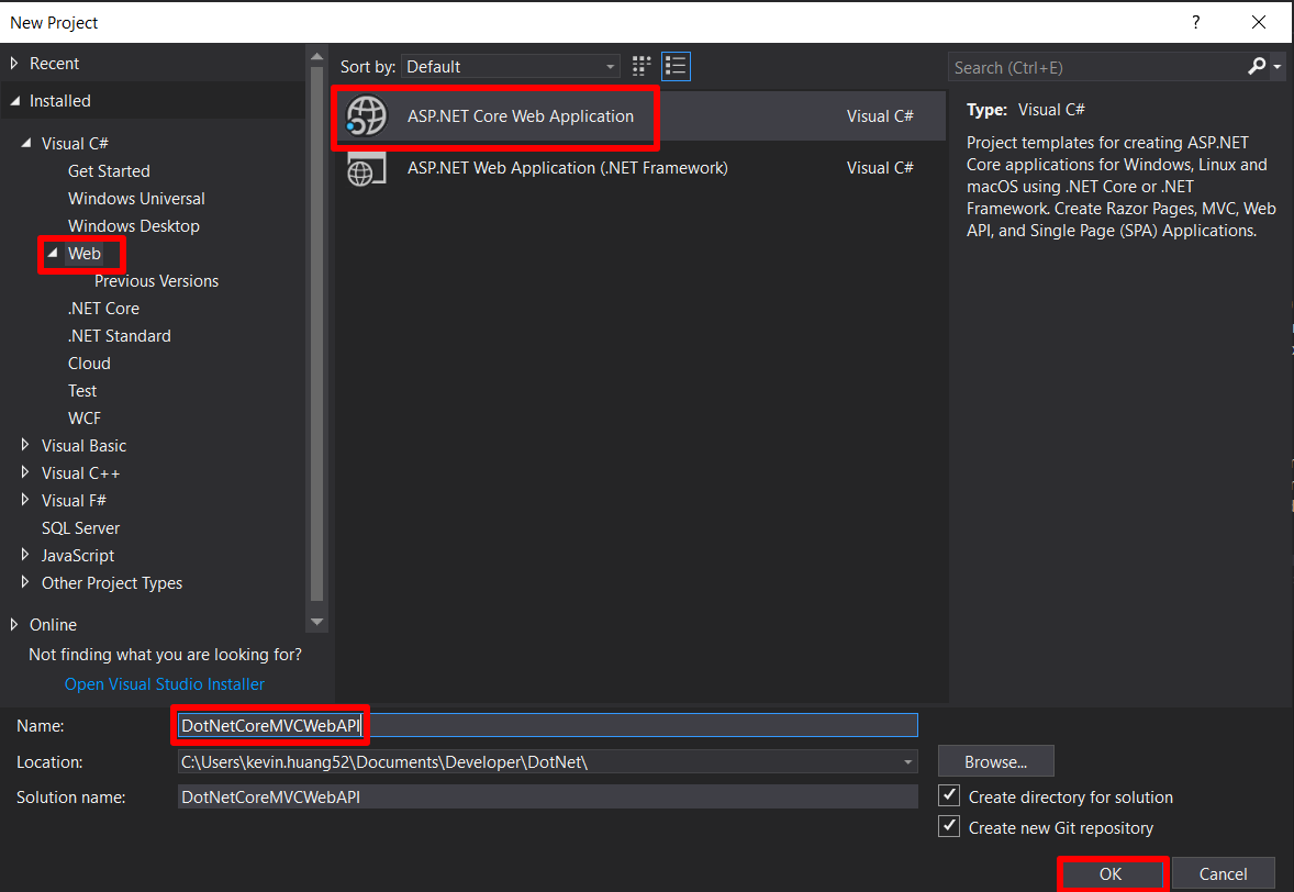 3.選擇左邊C#中的Web->點選ASP.NET Core Web Application->取一個適合的檔案名稱->點選OK建立專案